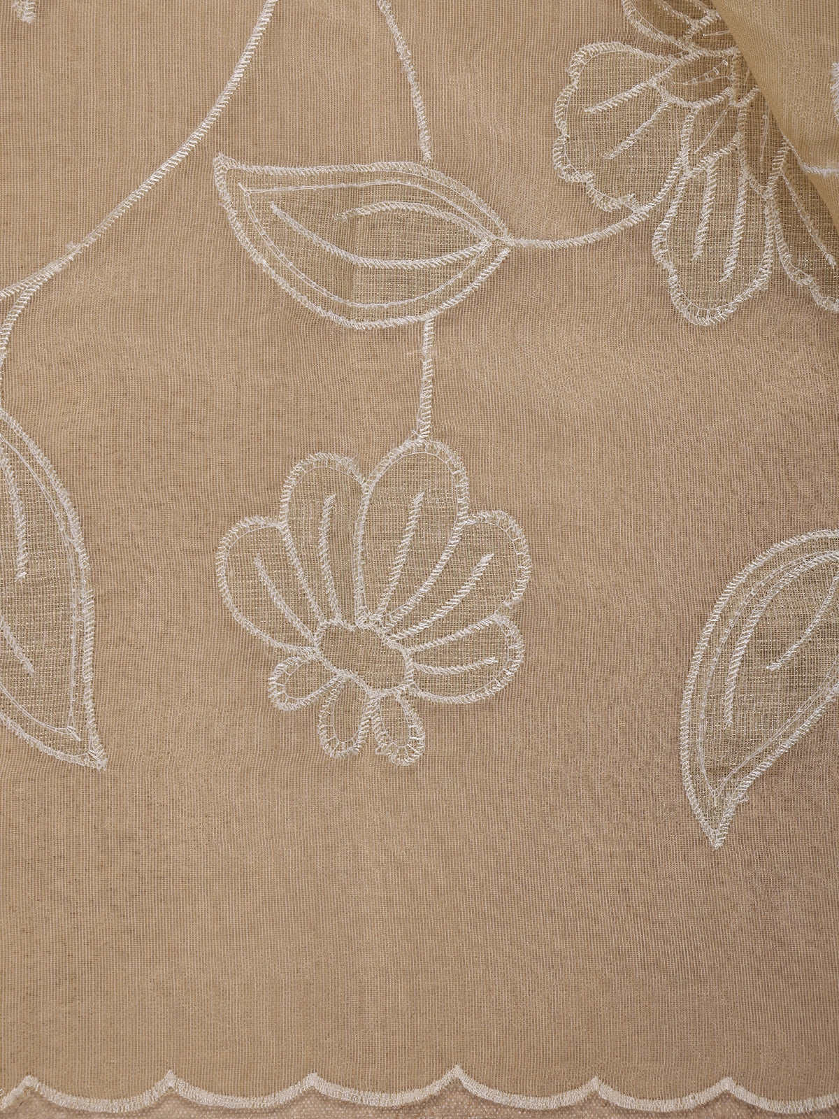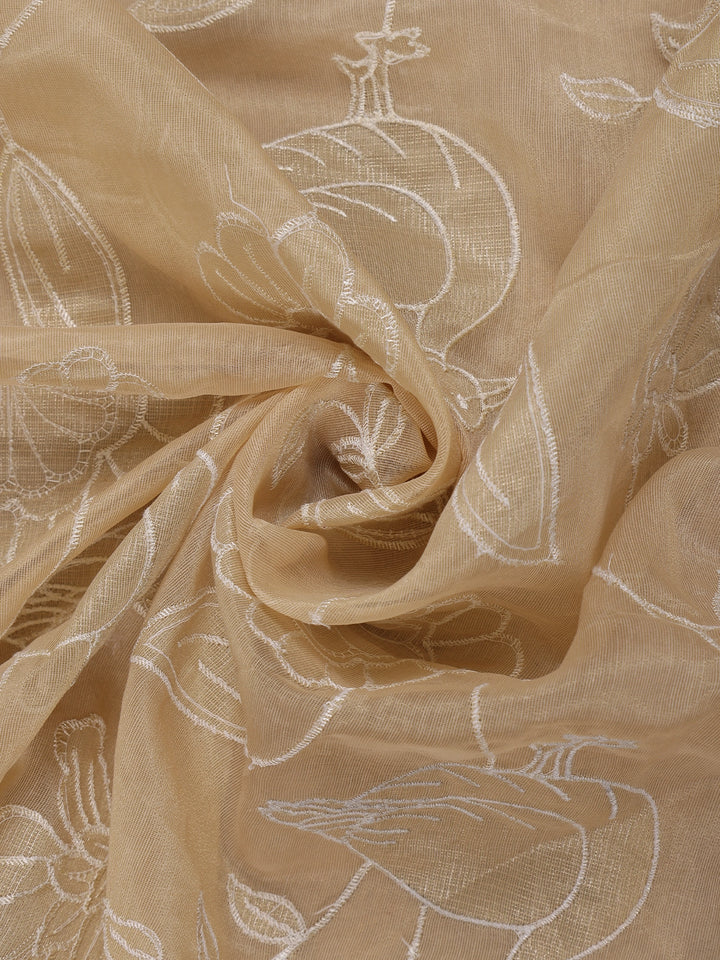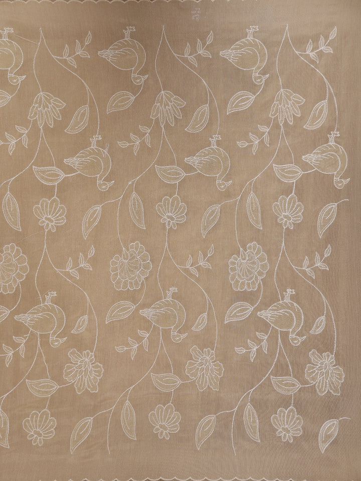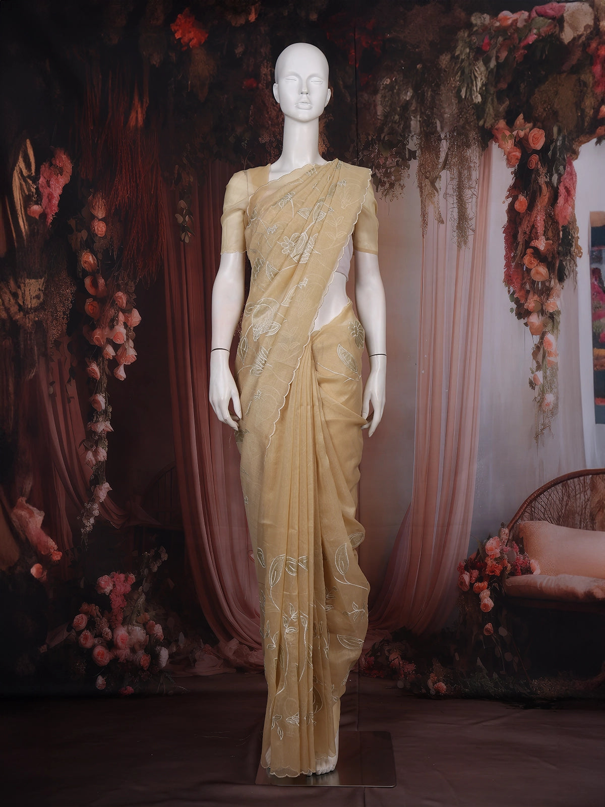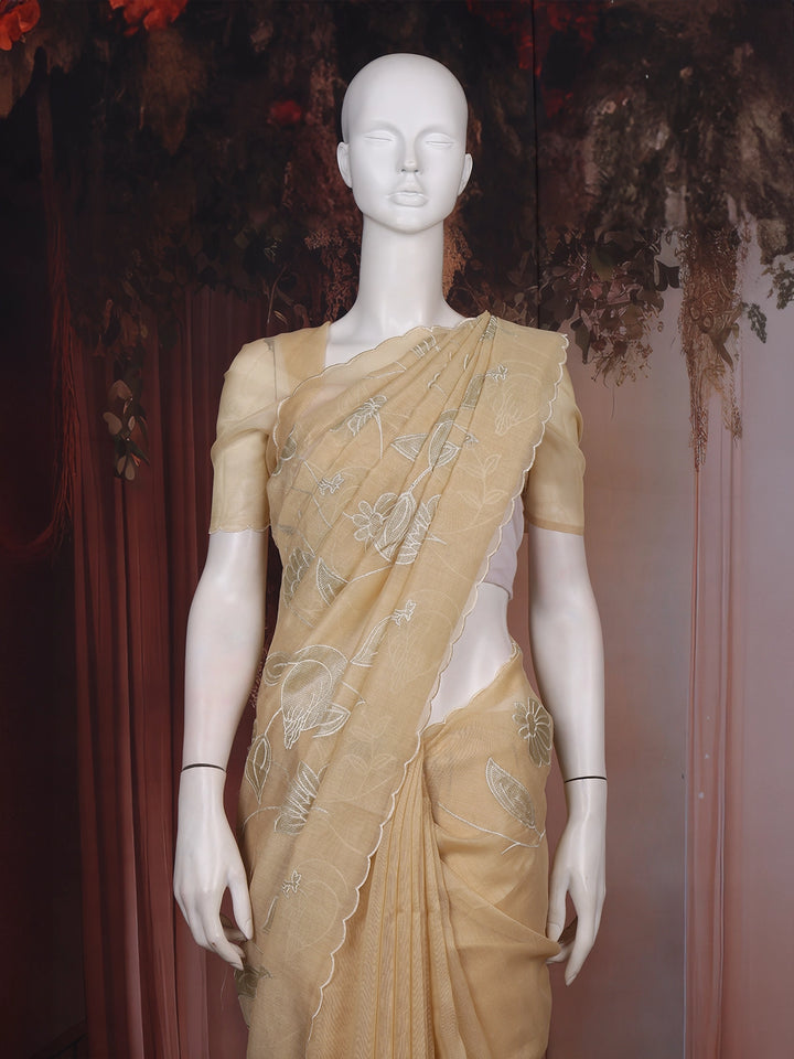 Grace meets sophistication in this elegant Sandal Tissue Saree, adorned with delicate floral and bird embroidery that enhances its ethereal charm. The saree features fine thread embroidery with motifs of blooming flowers and perched birds, intricately crafted across the body for a refined and graceful appearance. The scalloped border adds a soft, feminine touch, making it an ideal choice for festive gatherings, daytime celebrations, and elegant occasions.