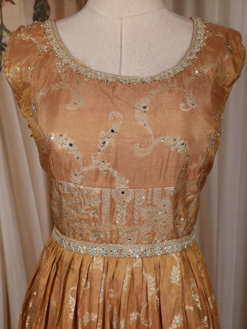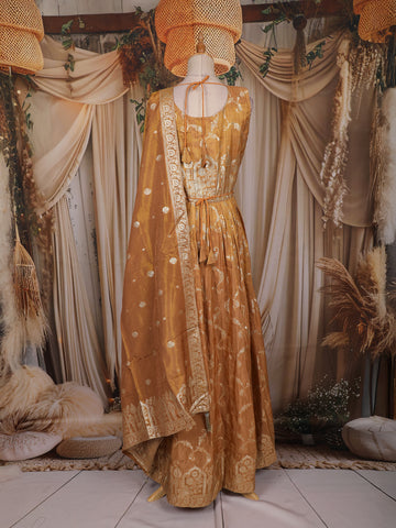Radiate regal elegance in this Sandal Banarasi Silk Anarkali Gown with Dupatta, a masterpiece that embodies traditional artistry and festive grandeur. Crafted from luxurious Banarasi silk, this ensemble reflects a seamless blend of heritage craftsmanship and contemporary grace.