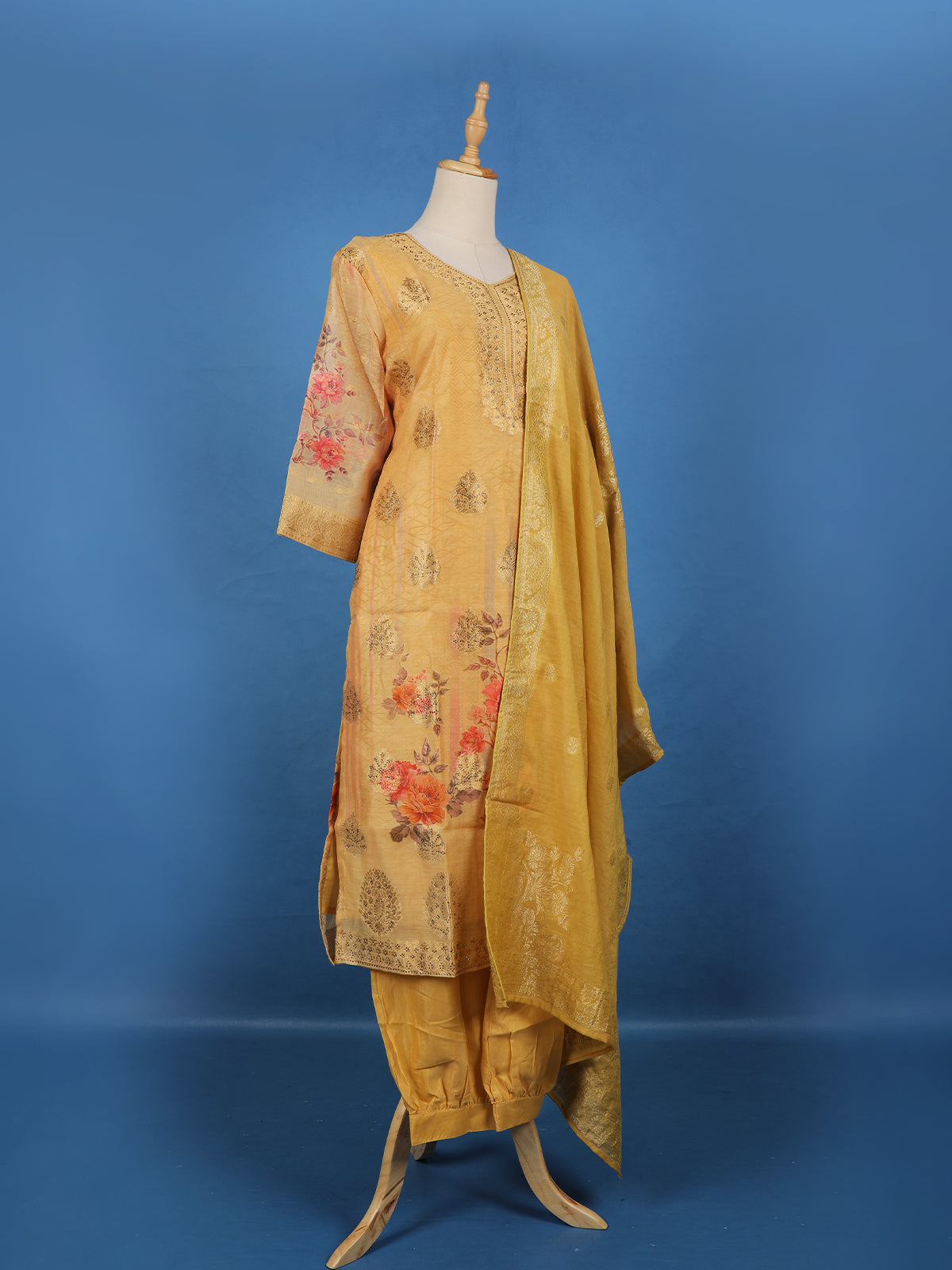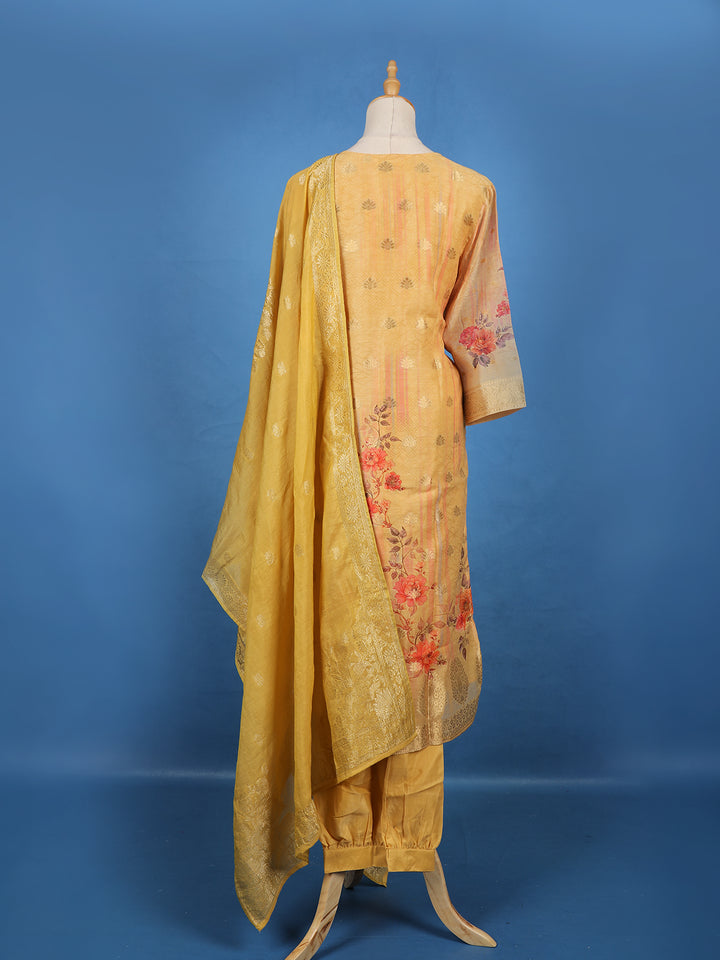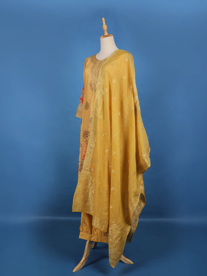 The delicate Banarasi weave, highlighted with intricate gold thread detailing, reflects the elegance and richness synonymous with traditional Indian attire. The set is completed with a coordinated zari-woven dupatta, featuring ornate floral patterns and a resplendent border that adds royal finesse to the ensemble.