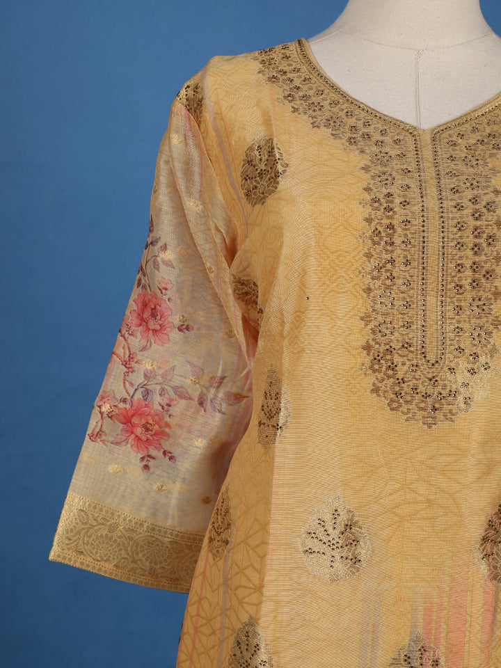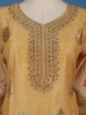 Step into timeless grandeur with this Sandal Zari Embroidered Banarasi Silk Straight-Cut Salwar Suit, a masterpiece of Banarasi craftsmanship that radiates understated luxury. Crafted from premium silk fabric, the kurta showcases an exquisite zari embroidered neckline and motifs, blending regal artistry with a soft sandal hue that flatters every complexion.