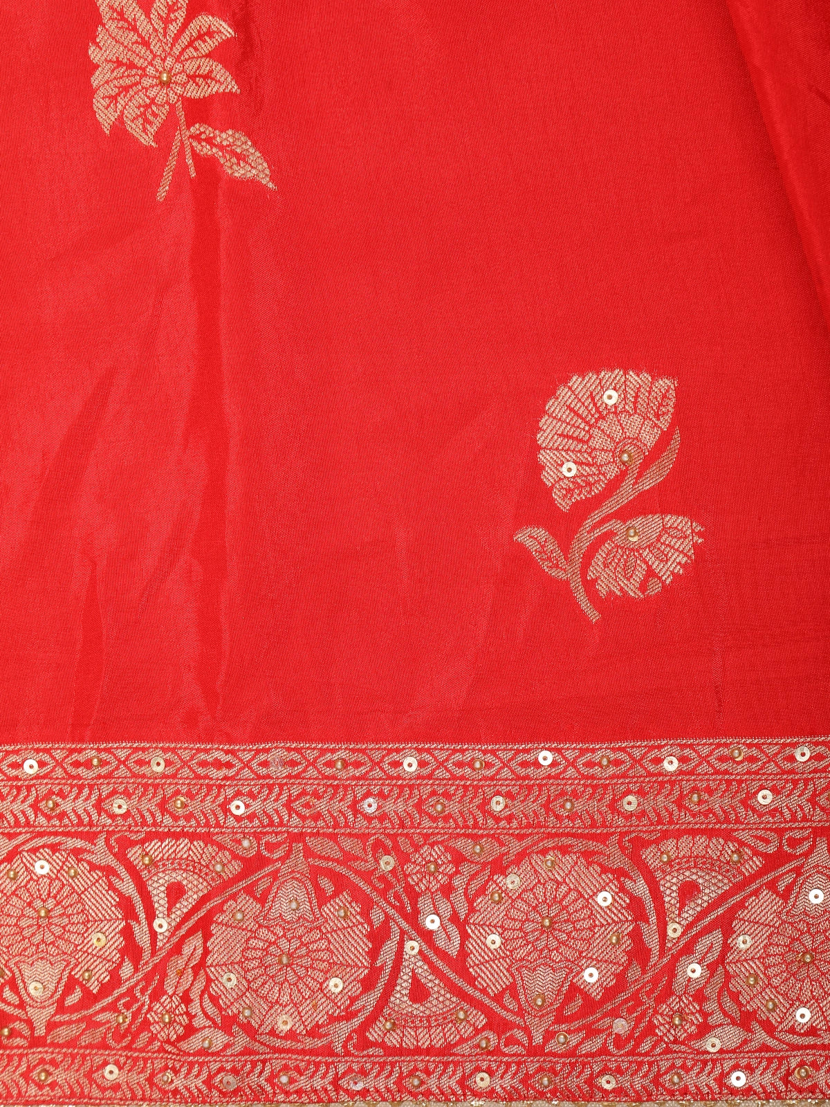 The saree body is adorned with elegant floral zari woven motifs, delicately placed across the vibrant red base for a refined and sophisticated appeal. Enhancing its richness is a heavily detailed designer zari border, intricately woven with traditional floral and paisley patterns that add depth and opulence. The pallu is beautifully highlighted with dense Banarasi zari weaving, showcasing fine craftsmanship and making the saree truly stand out.
