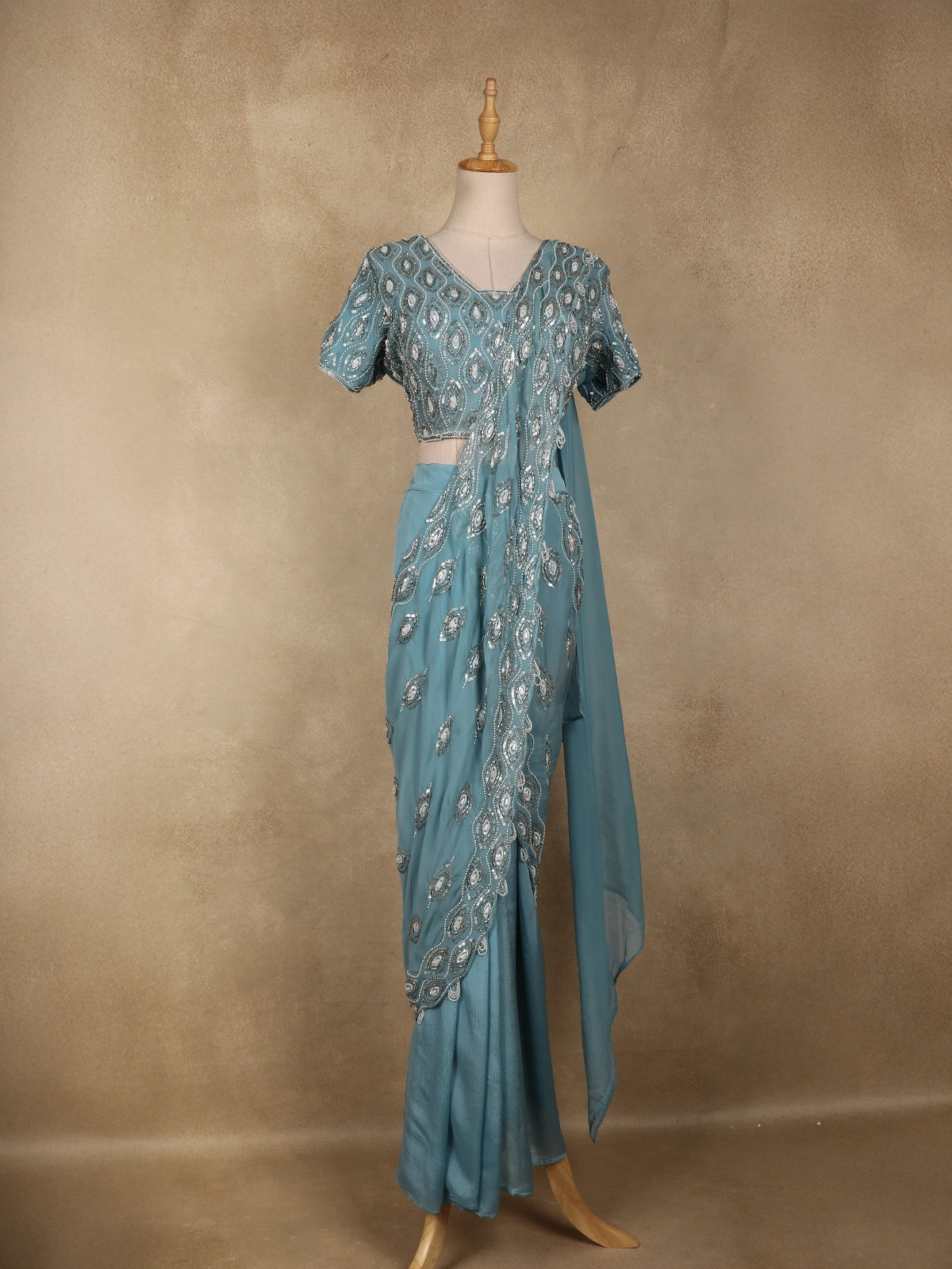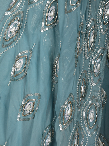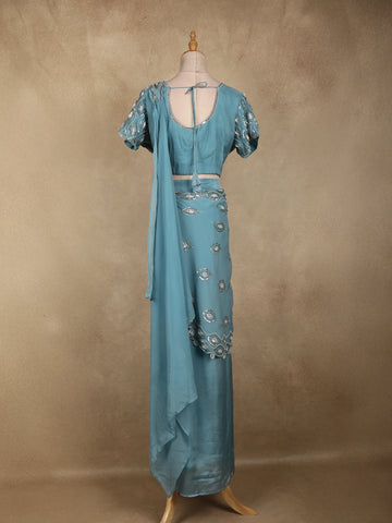 Elegant and contemporary, this sea blue ready-to-wear georgette saree is designed for effortless glamour and modern festive styling. Crafted from lightweight georgette, the saree features all-over geometric embroidery enhanced with shimmering sequins, creating a refined sparkle that beautifully catches the light. The fluid drape adds graceful movement, making it a perfect choice for statement occasions.