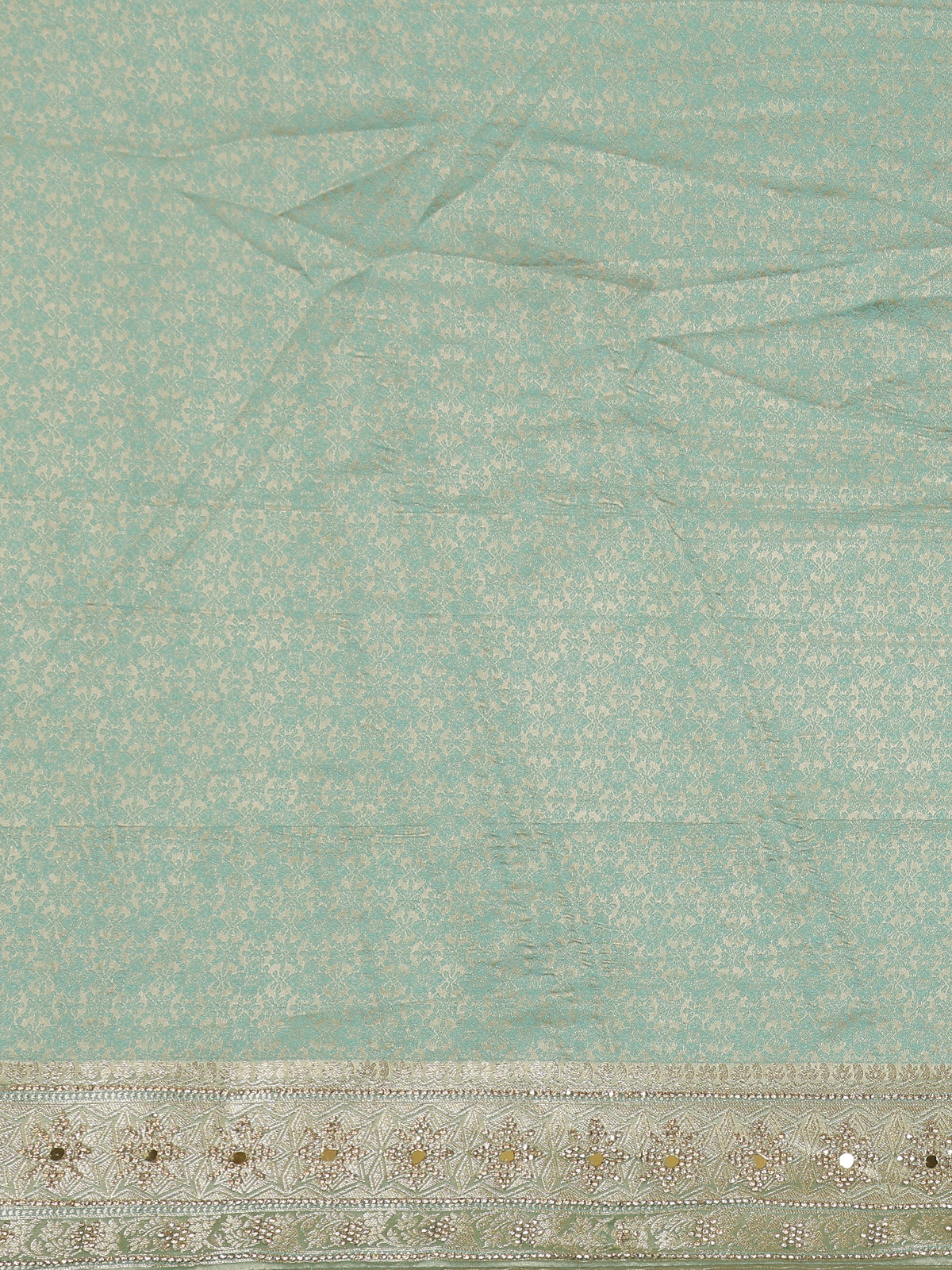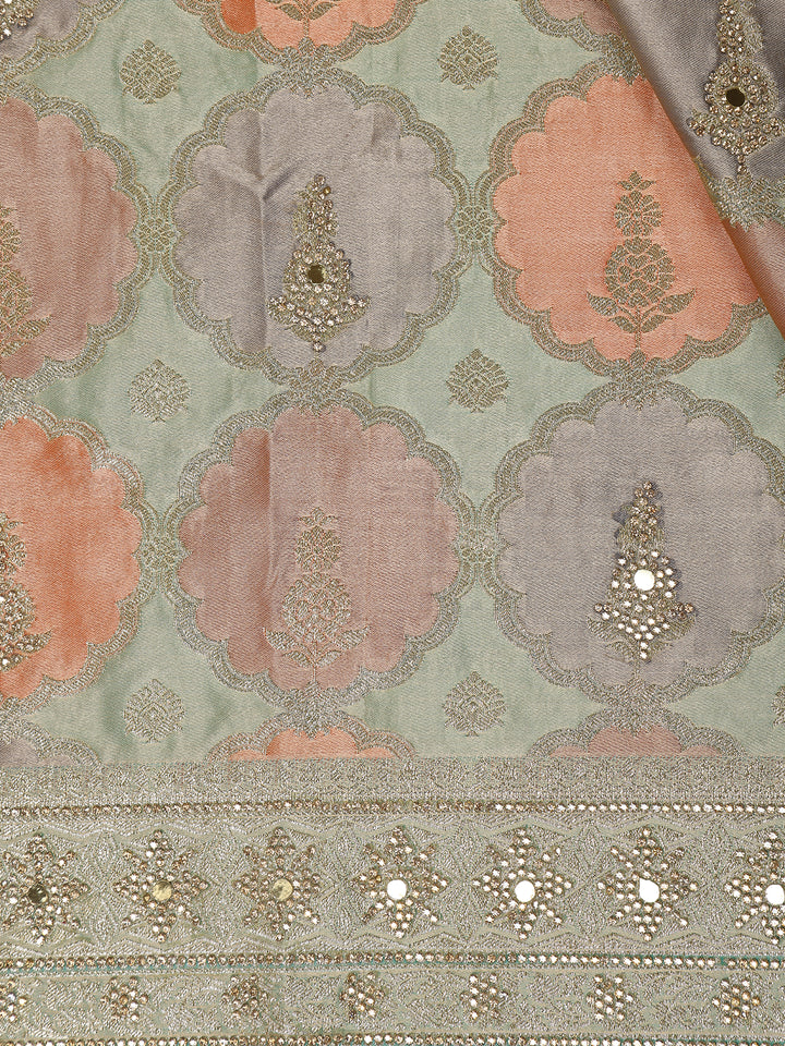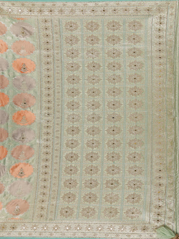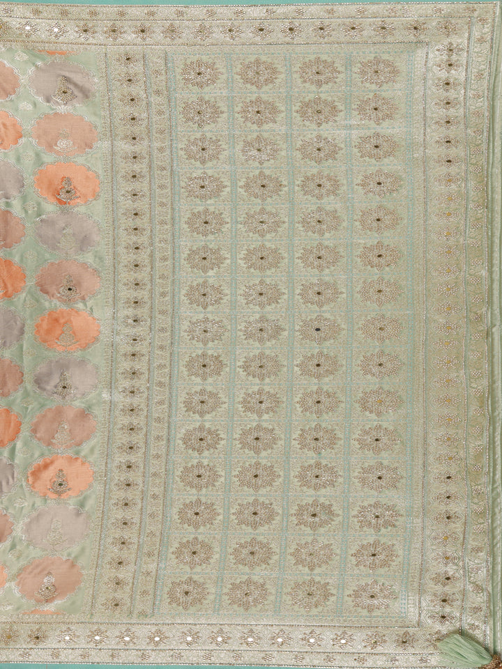 Sea Green and Peach Floral Woven Design Banarasi Saree with Designer Zari Border