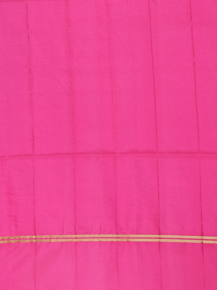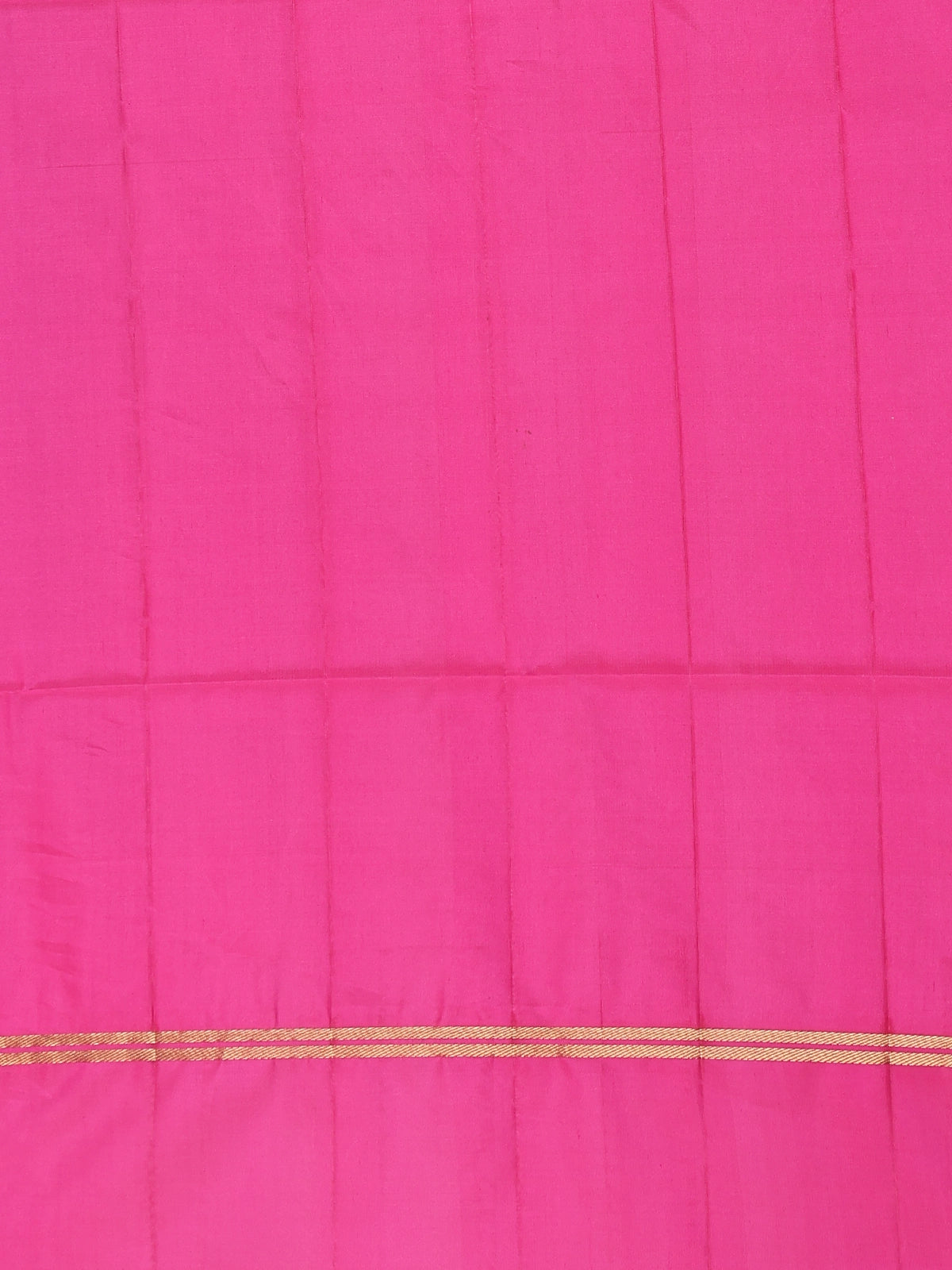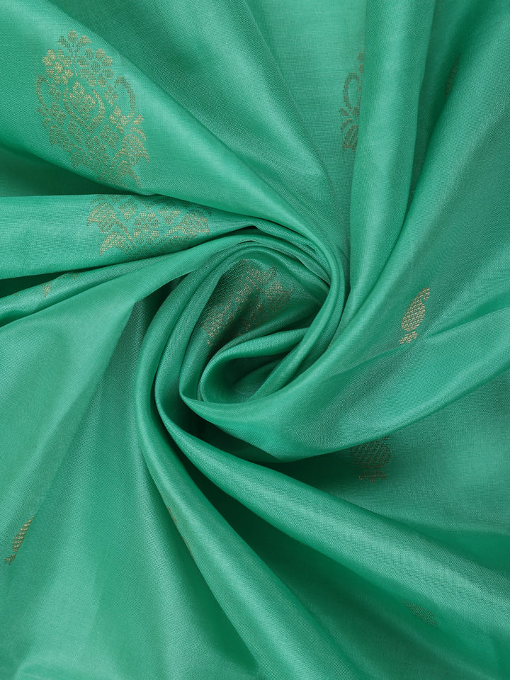 A striking blend of elegance and vibrance, this Soft silk saree comes in a soothing sea green body beautifully contrasted with a bright pink border and pallu. The body is adorned with intricate gold zari buttas, lending a subtle festive shimmer. The broad zari border and richly woven pallu in pink enhance the saree’s grandeur, making it ideal for festive and celebratory occasions. The contrast pink blouse piece completes the ensemble with a refined traditional touch.