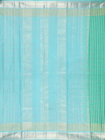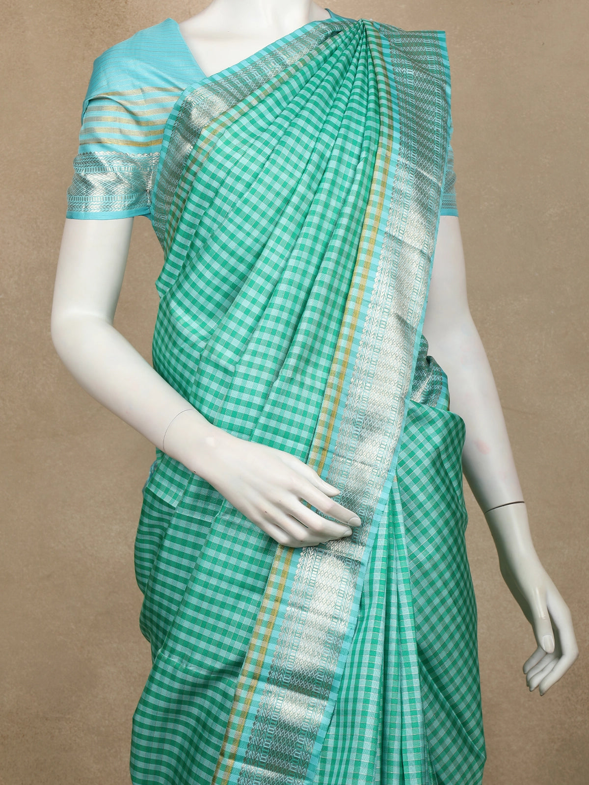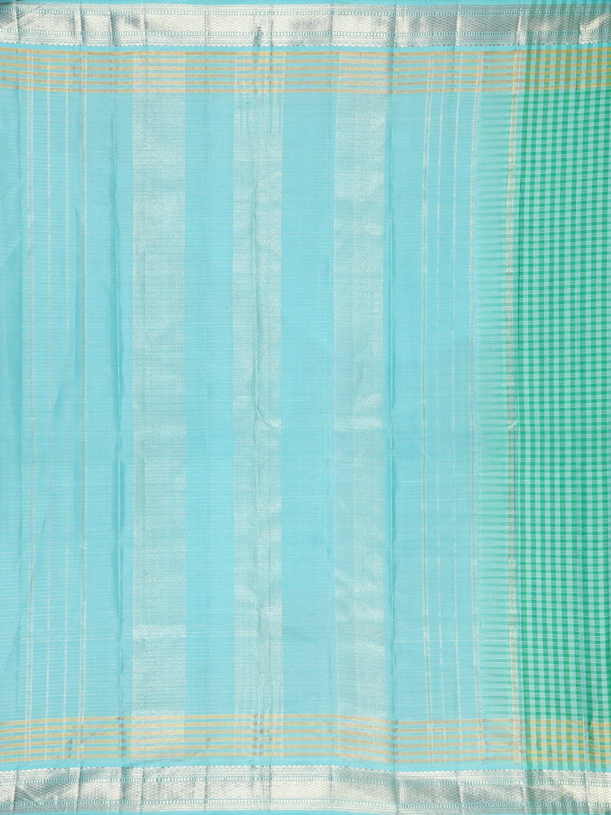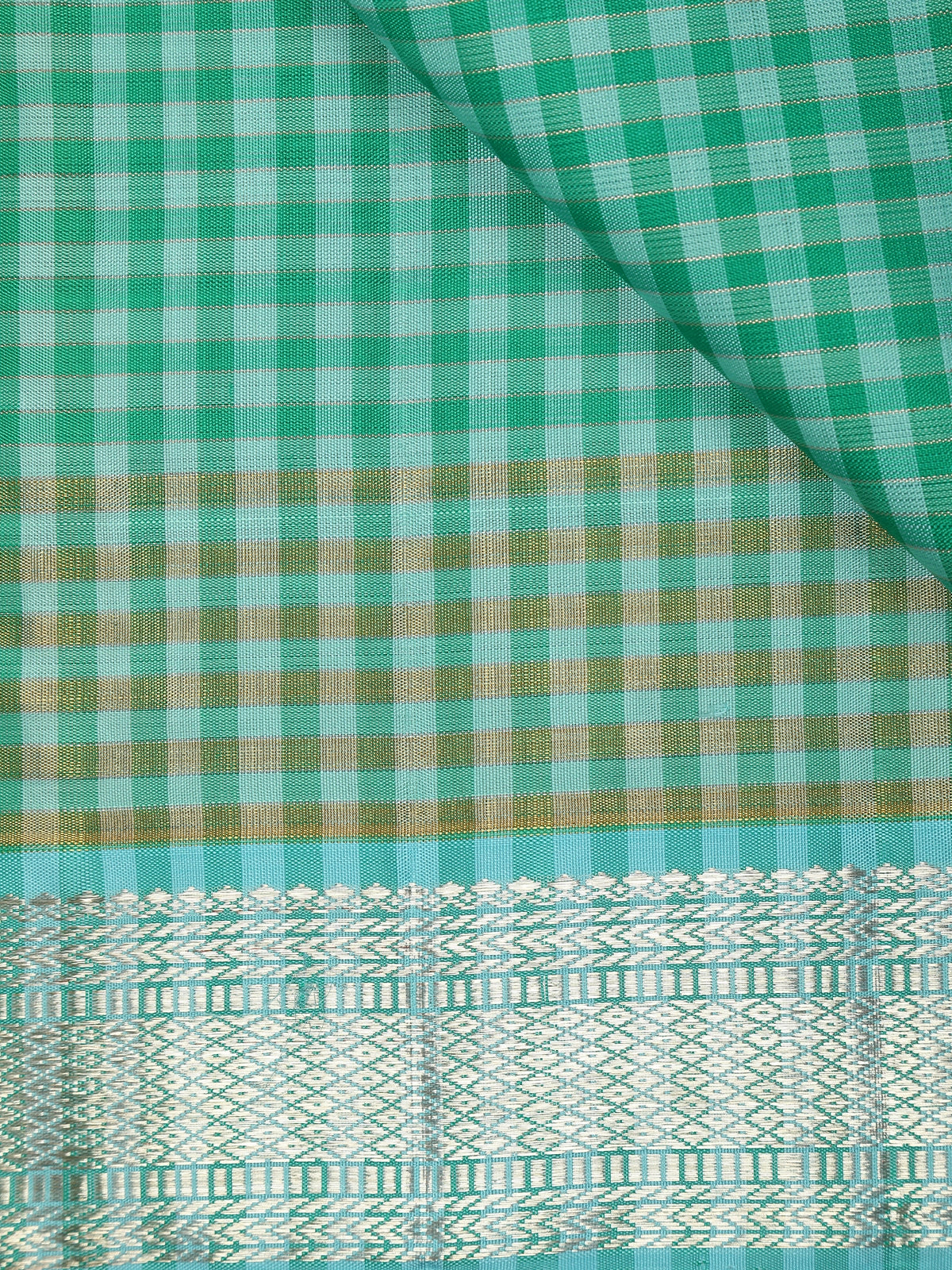 Sea Green Checked Woven Pure Kanchipuram Silk Saree with Silver Zari Border