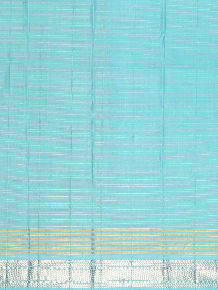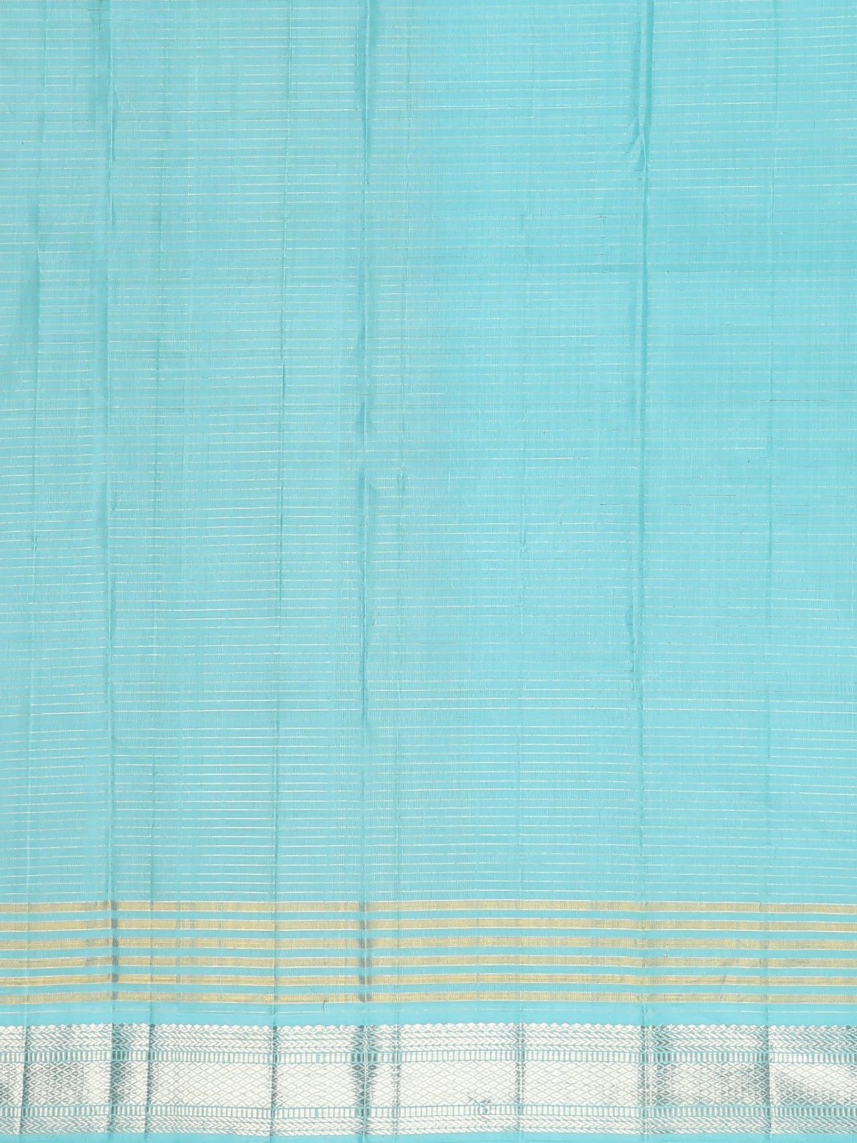 The saree is beautifully complemented with a contrast pallu in a lighter sea green shade, detailed with intricate silver zari weaving that adds richness without overpowering the subtle body design. The silver zari border enhances the elegance of the saree, making it a perfect blend of sophistication and festive style.