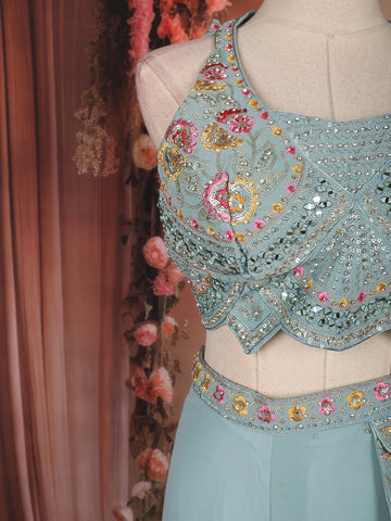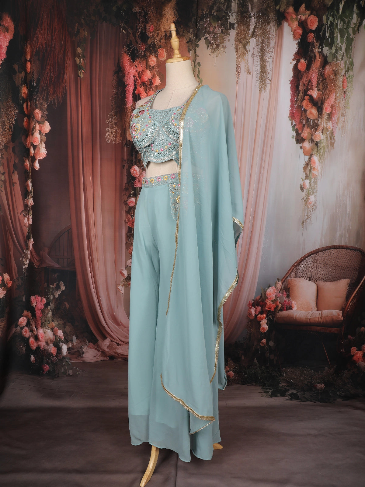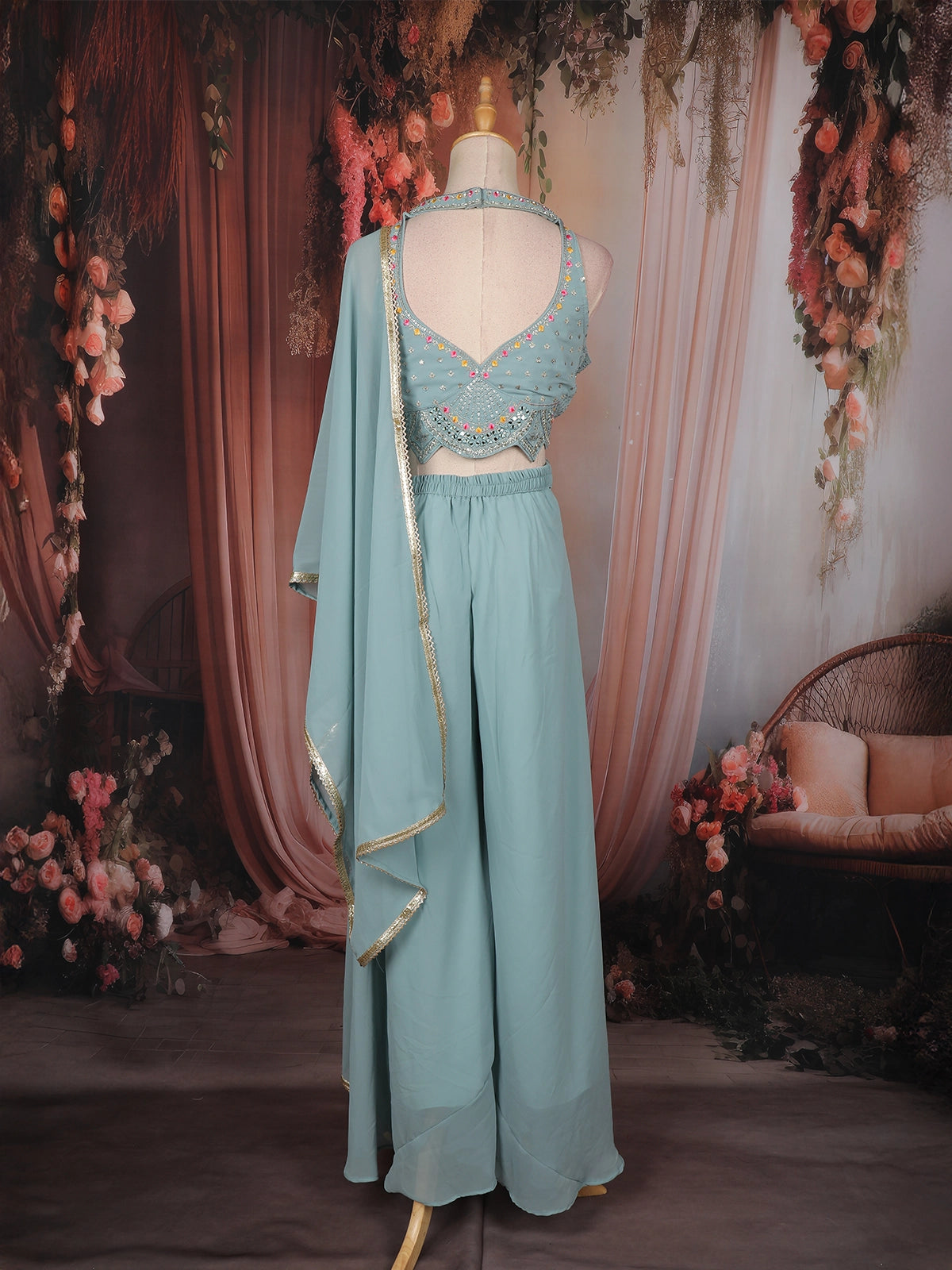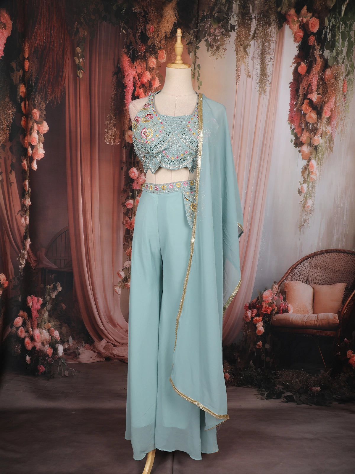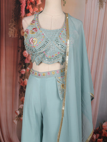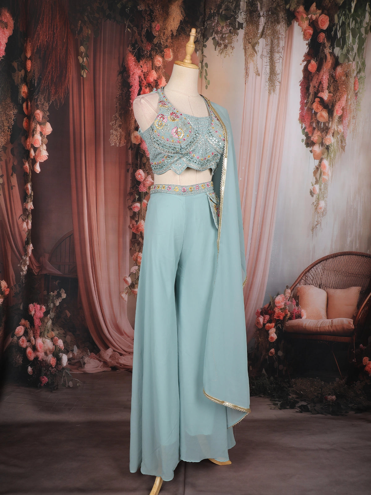 This Light Blue palazzo suit is a graceful blend of elegance and modern festive style. Crafted in soft georgette fabric, the outfit features a beautifully embellished sleeveless top highlighted with delicate floral embroidery, sequins, and fine bead detailing that adds a subtle shimmer. The coordinated embroidered waistband enhances the overall look while giving a neat, polished finish.