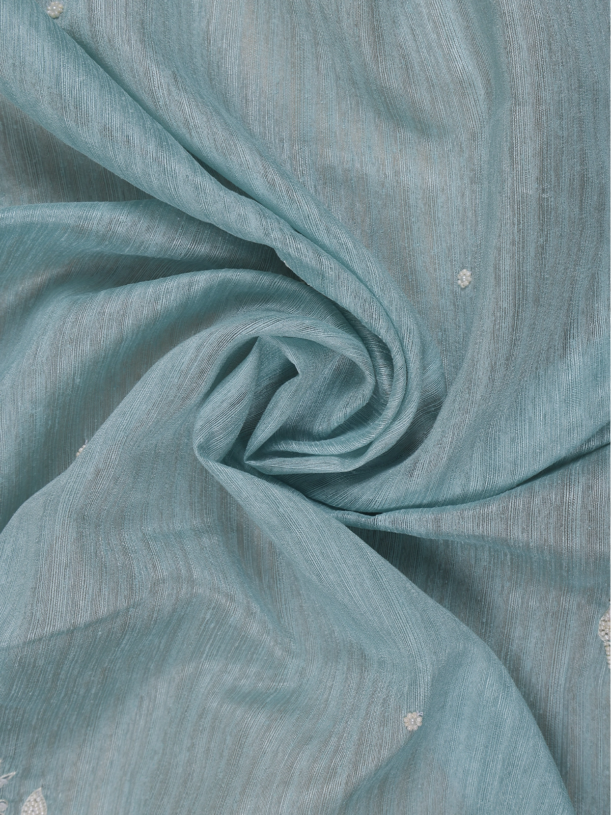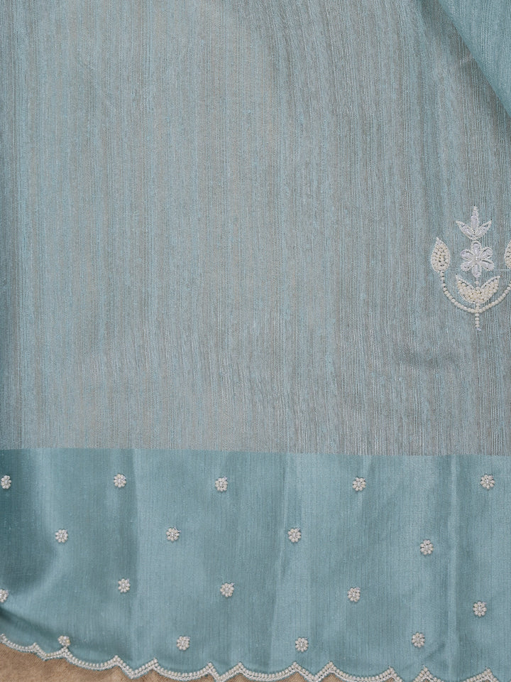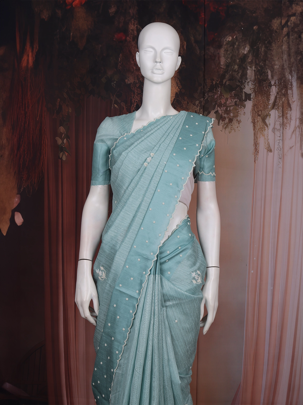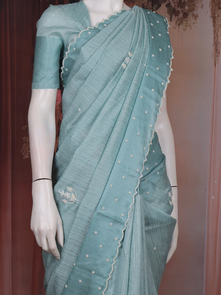 Crafted from lustrous raw silk, this Sea Green Floral Embroidered Saree radiates sophistication and serenity. The gentle sheen of the silk beautifully highlights the delicate floral embroidery that runs along the pallu and pleats. Its scalloped border adds a refined finish, making it perfect for daytime festivities or evening soirees.