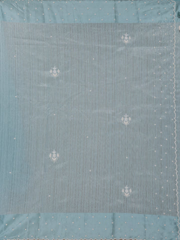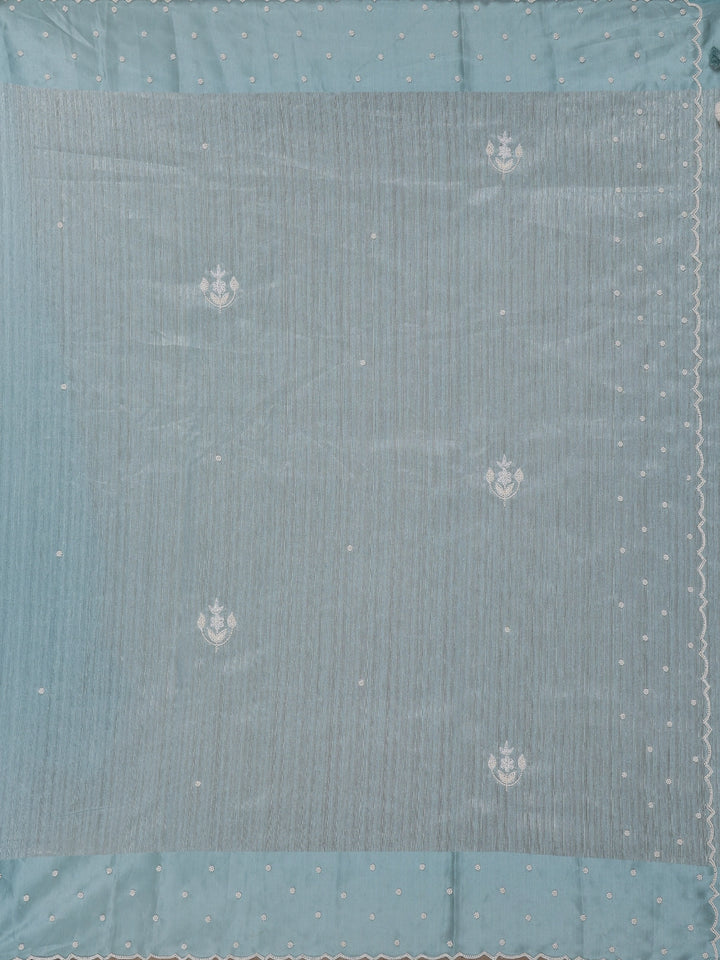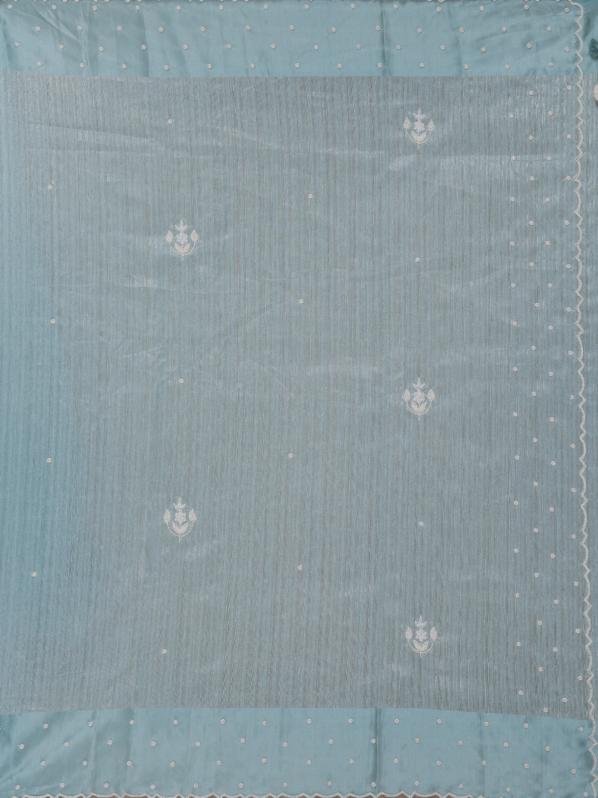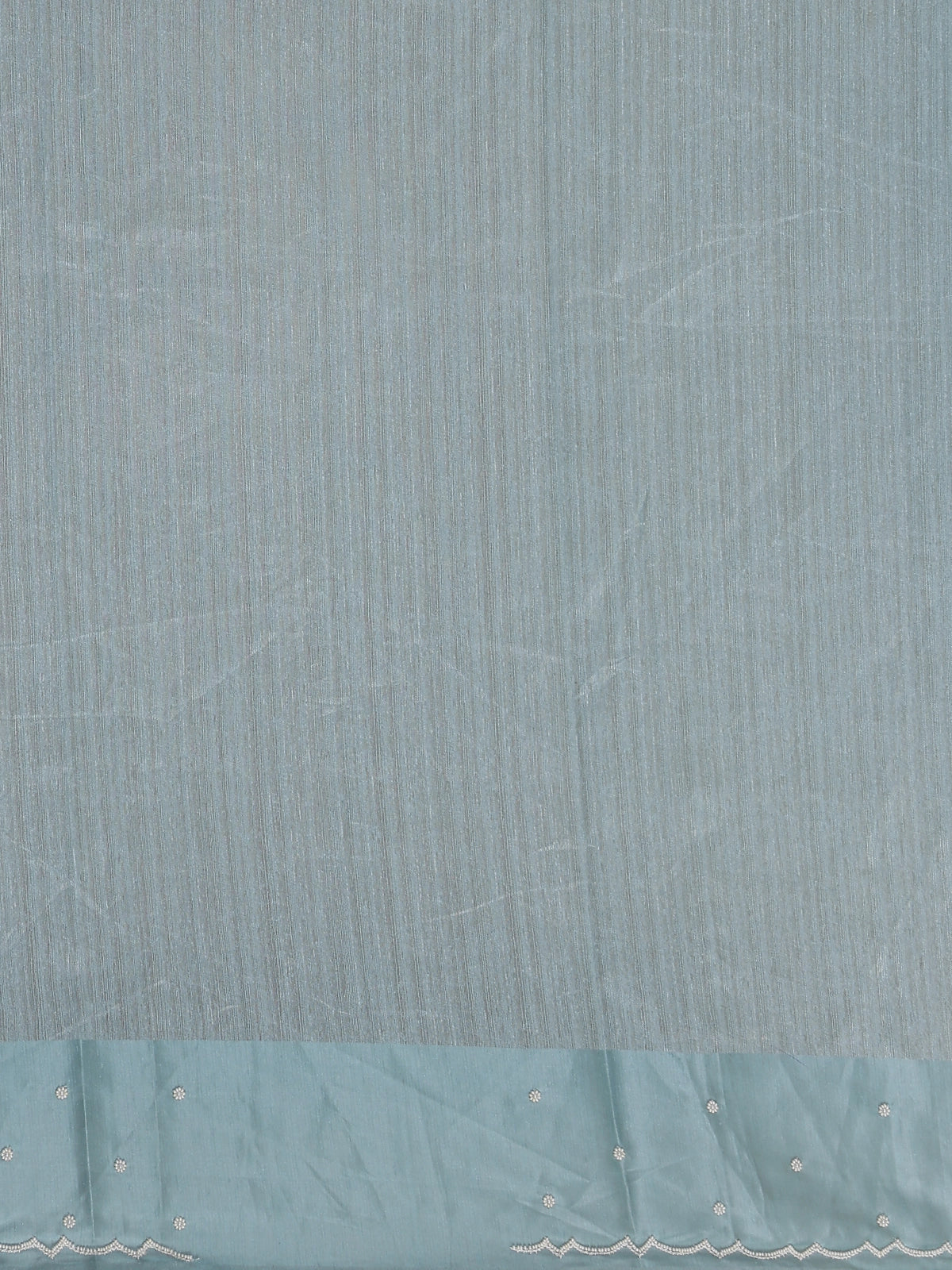 Crafted from lustrous raw silk, this Sea Green Floral Embroidered Saree radiates sophistication and serenity. The gentle sheen of the silk beautifully highlights the delicate floral embroidery that runs along the pallu and pleats. Its scalloped border adds a refined finish, making it perfect for daytime festivities or evening soirees.