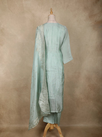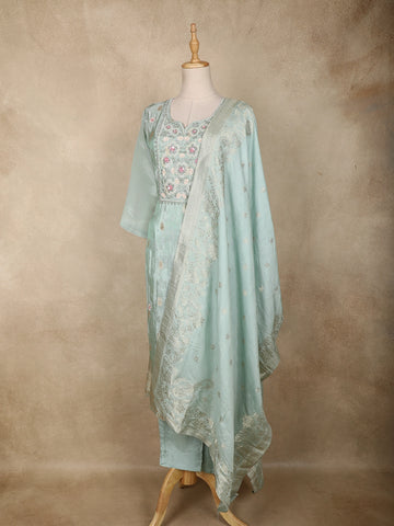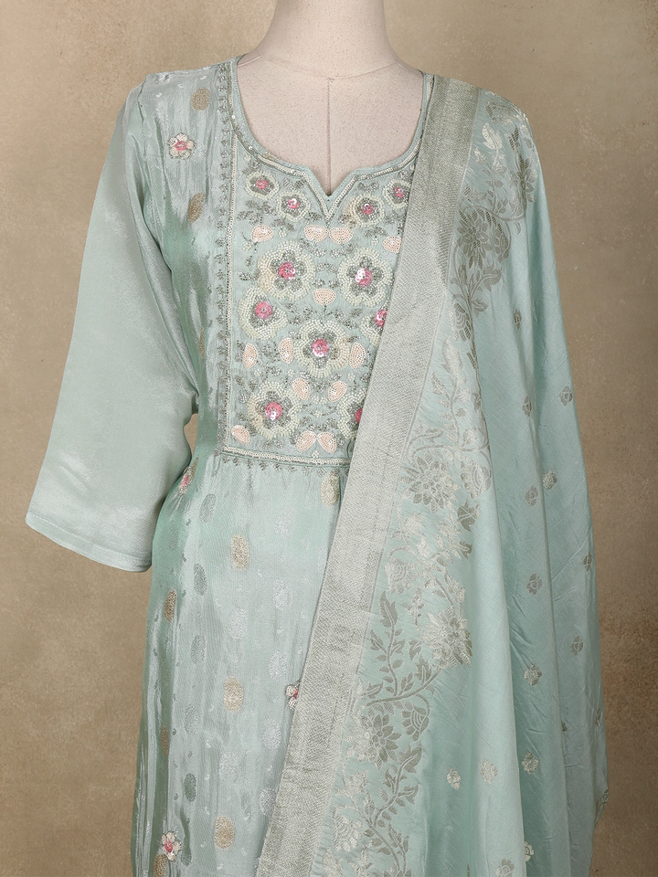 Sea Green Floral Embroidered Tissue Silk Salwar Suit with Dupatta