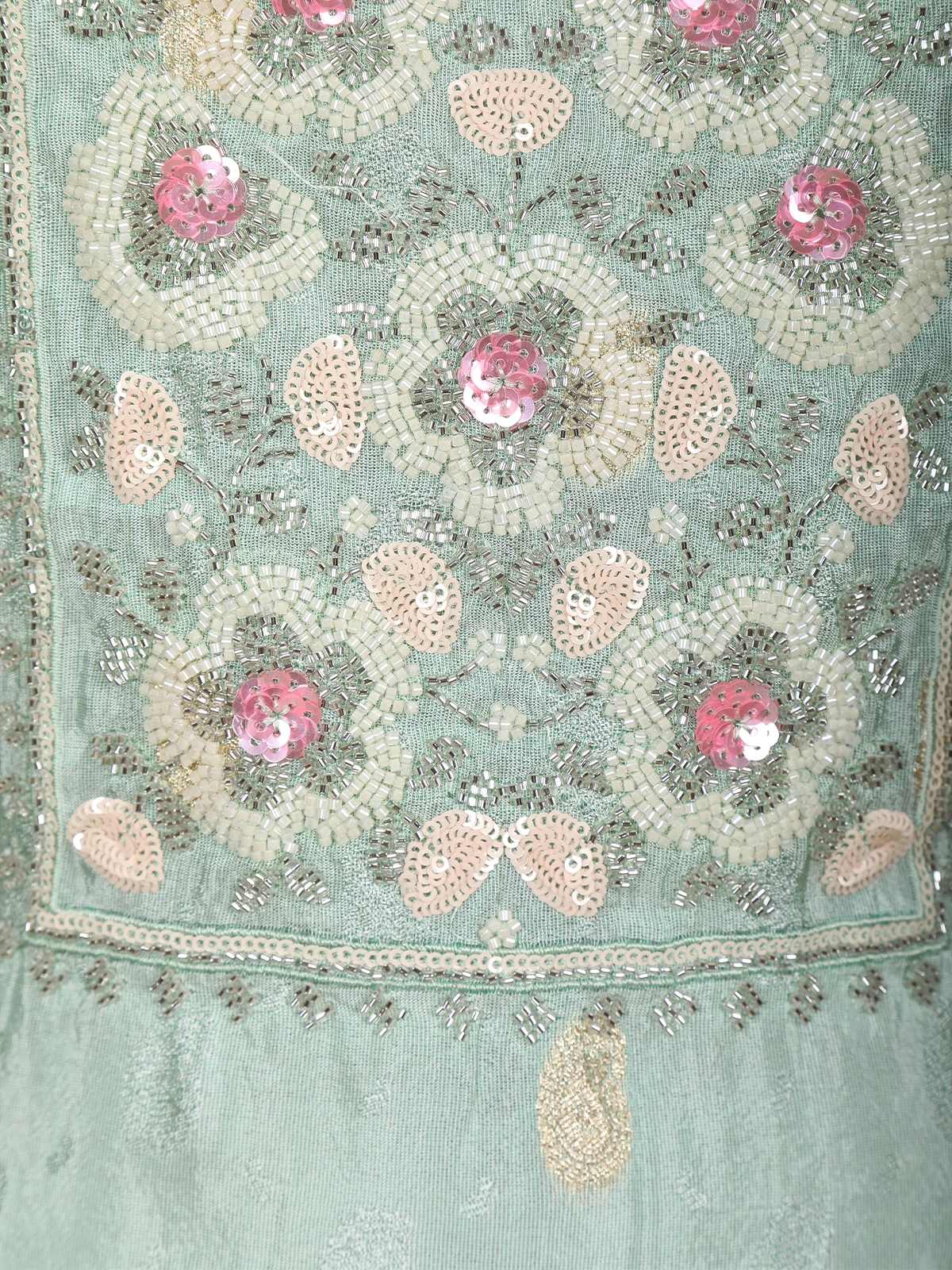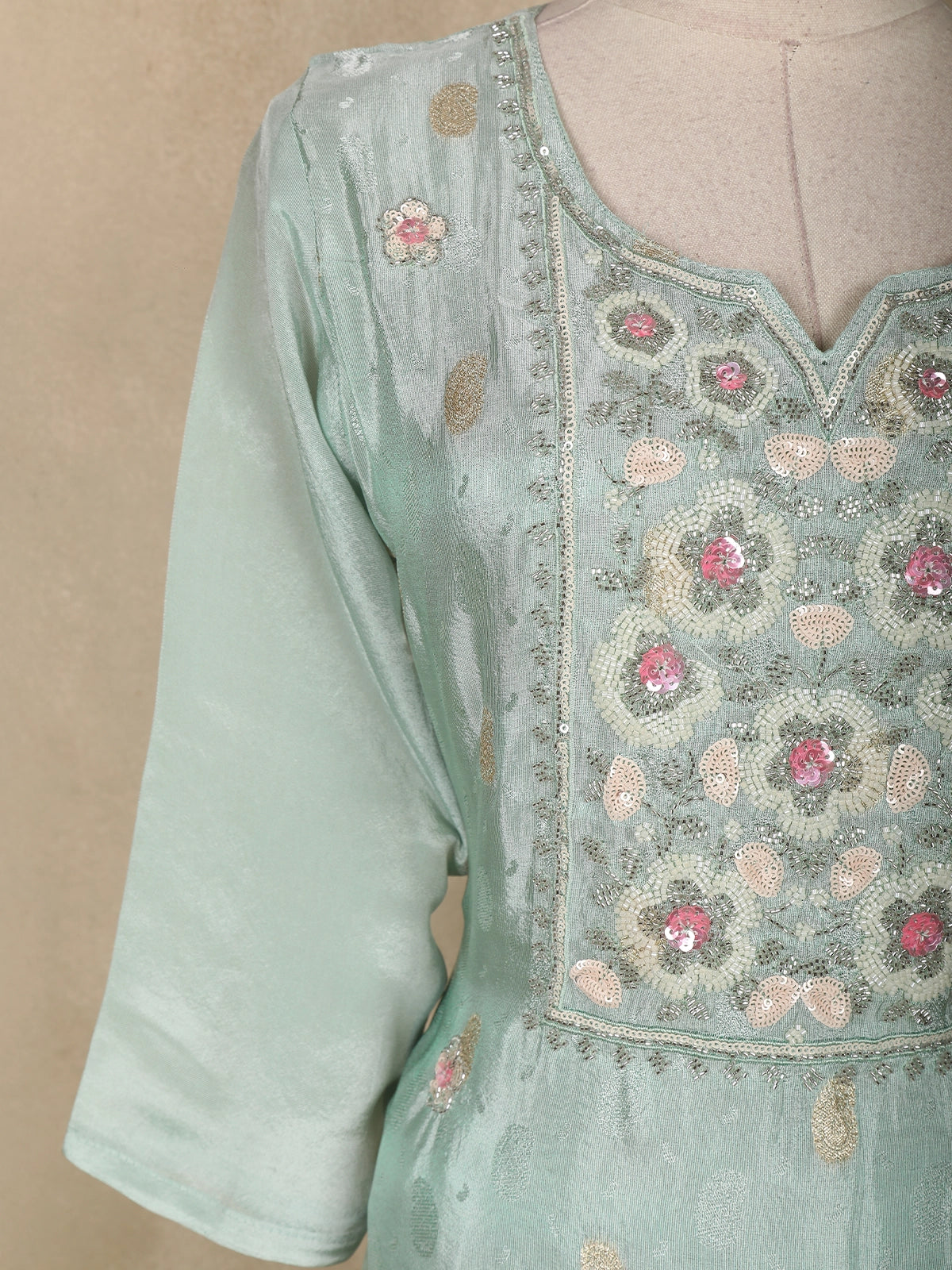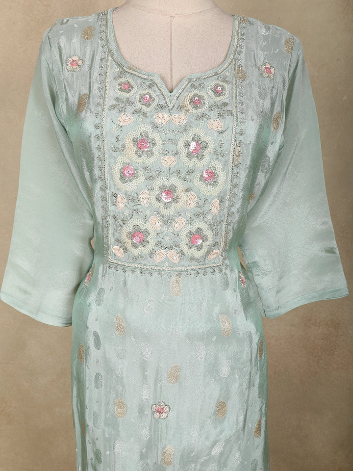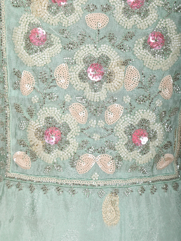 Grace your celebrations with sheer elegance in this Sea Green Tissue Silk Salwar Suit, designed with subtle shimmer and exquisite detailing. The kurta features beautiful floral embroidery on the yoke, highlighted with pastel pink sequins and zari threadwork for a delicate festive sparkle.