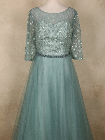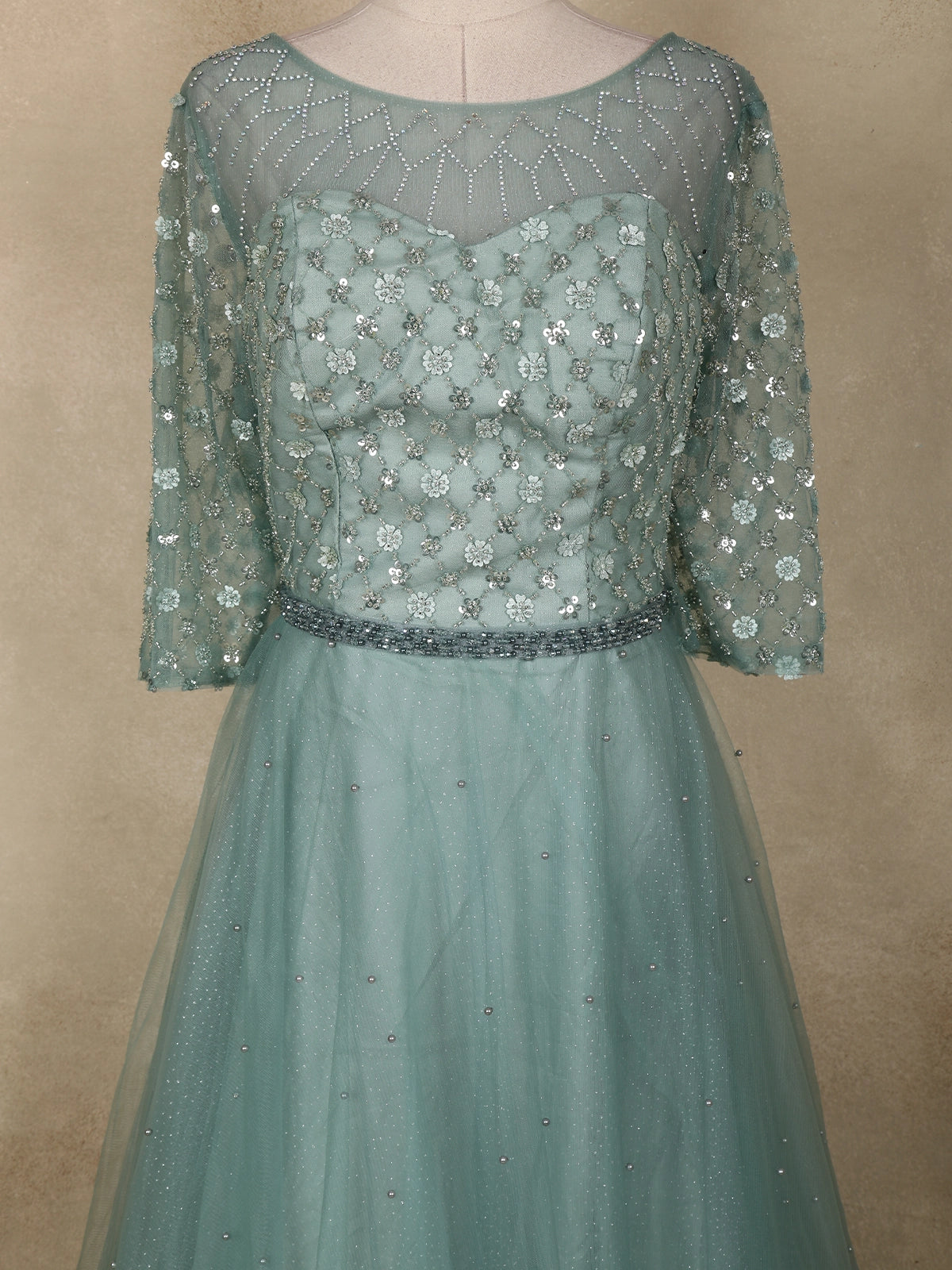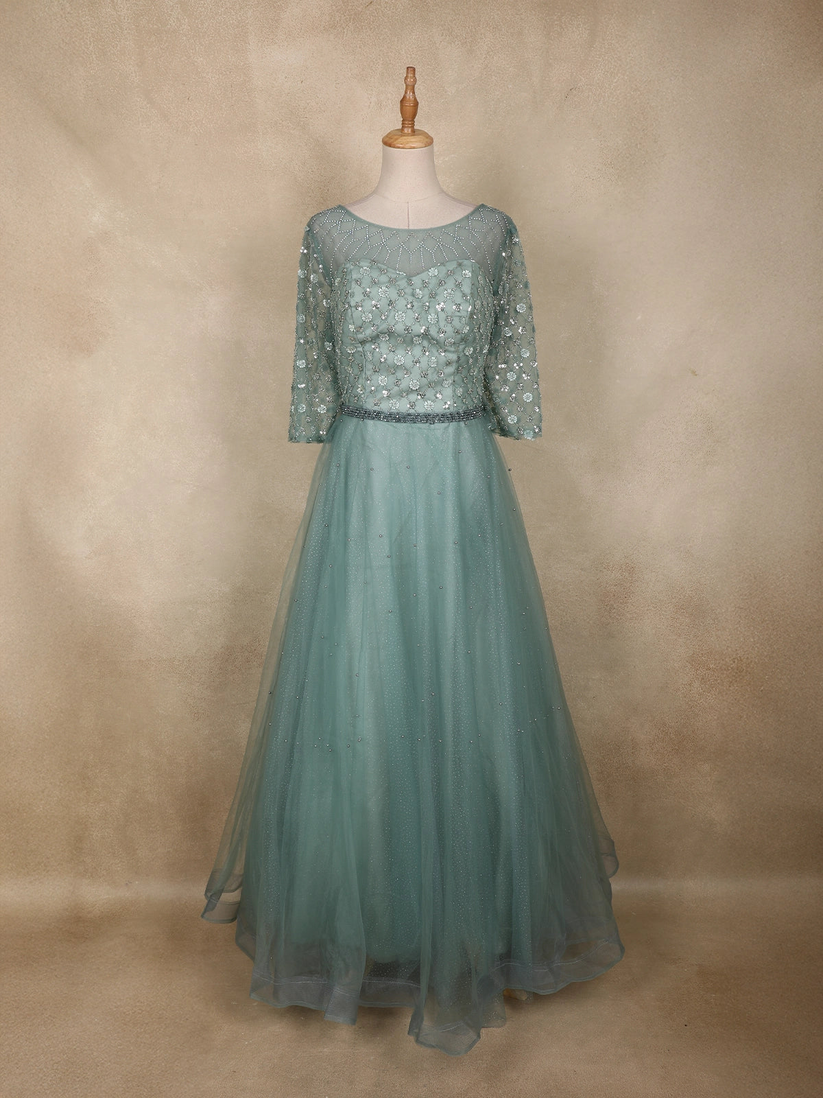 The refined boat neckline with a sheer yoke gives a sophisticated look, complemented by elegant 3/4th sleeves adorned with delicate floral sequin work. A sleek embellished waistline defines the silhouette beautifully, enhancing your natural shape. The flared skirt cascades into a mesmerizing full-length finish, making every step feel regal and graceful.
