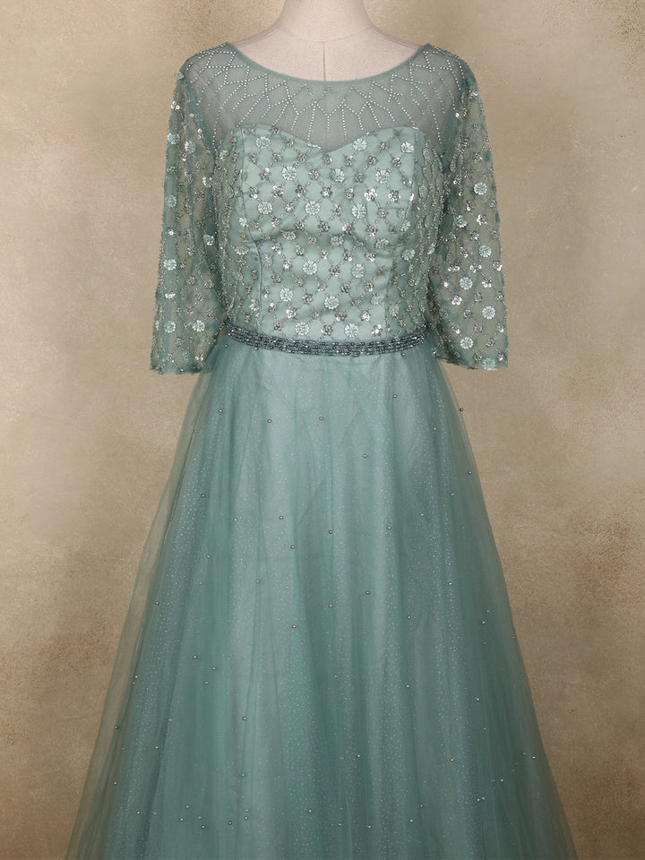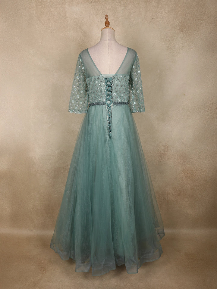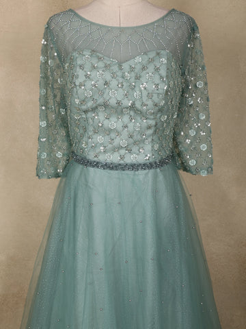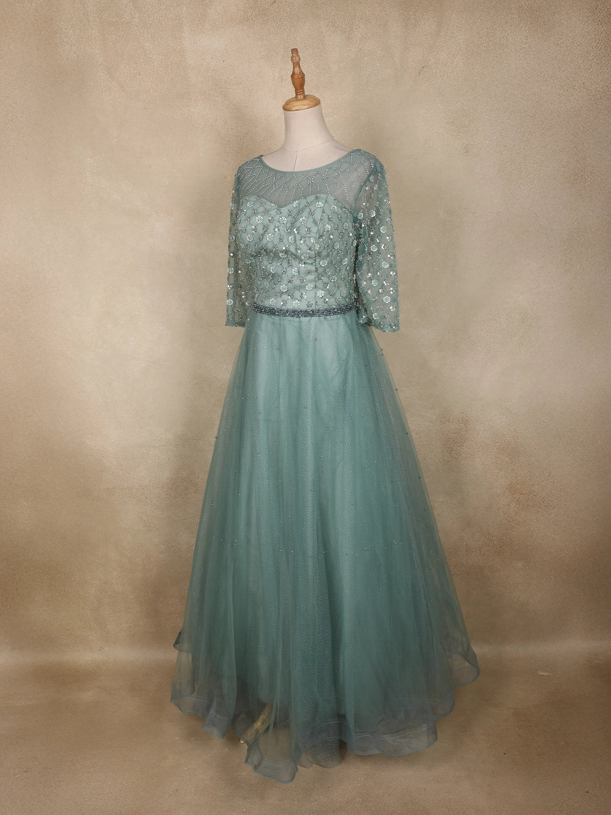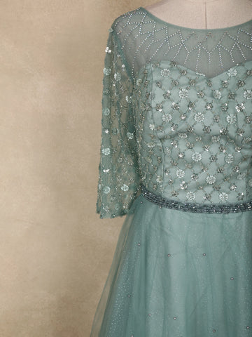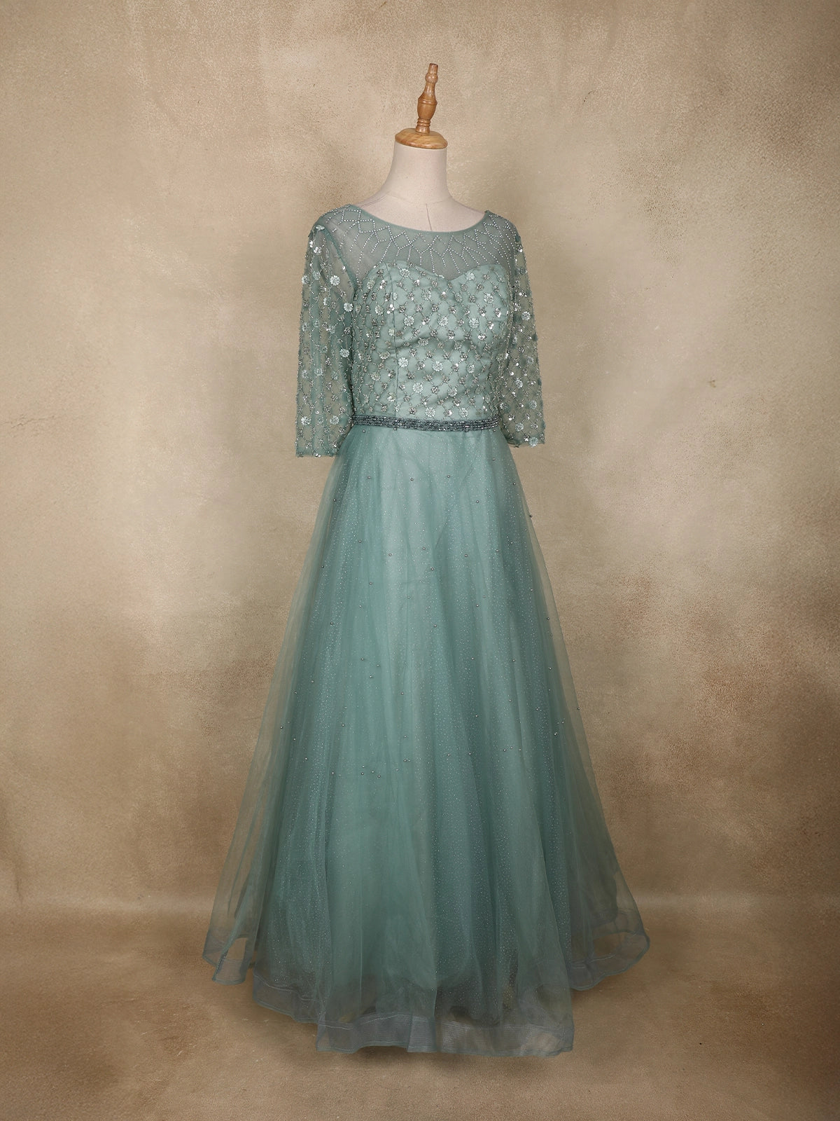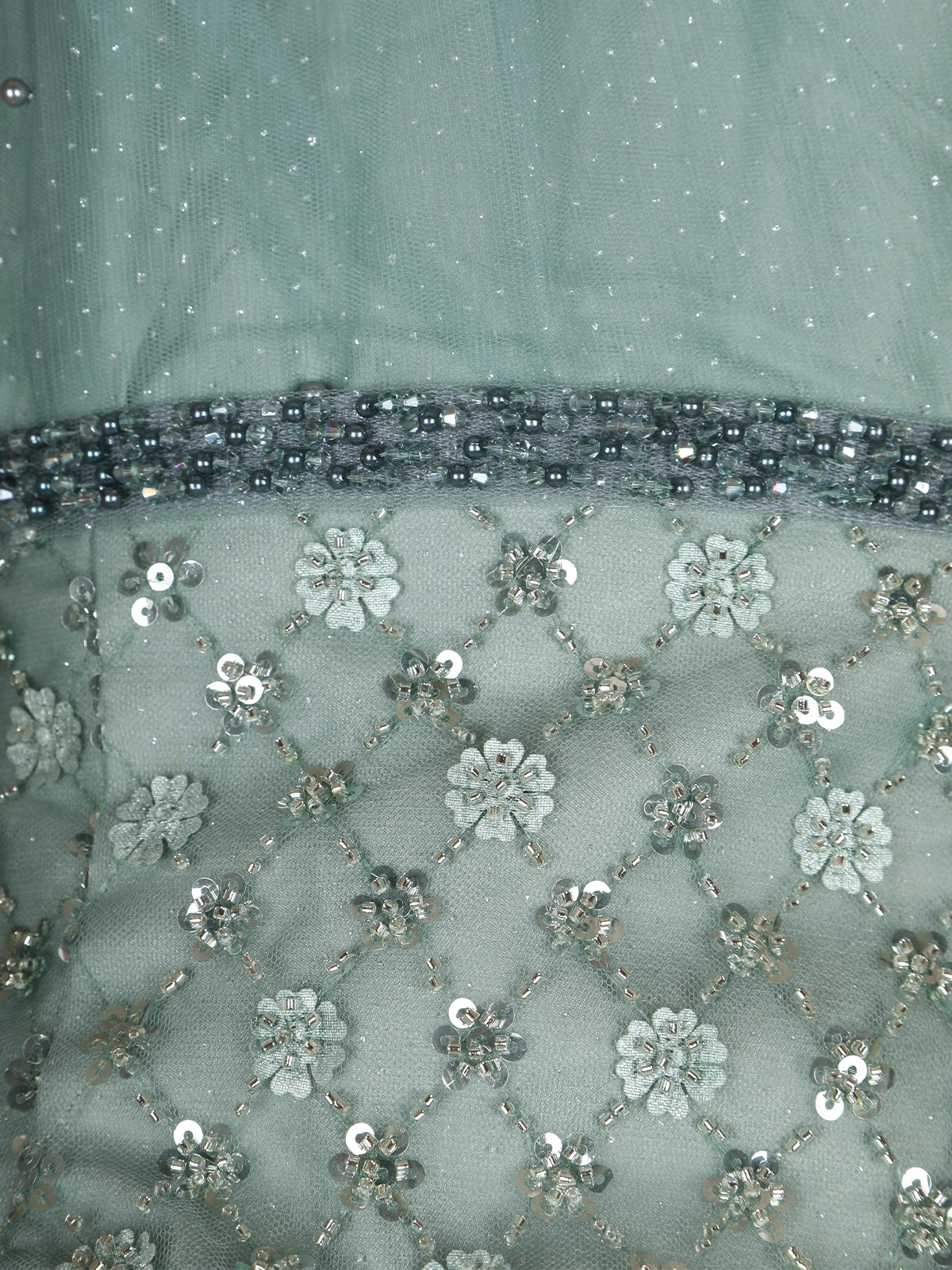 Step into the spotlight with this enchanting Sea Green Net Gown, designed to deliver a dreamy fairytale charm for your special evenings. The bodice features intricate sequin embellishments with floral accents, creating a dazzling shimmer with every movement. The gown is gracefully layered in soft net fabric, adding a voluminous flow while maintaining a lightweight and airy feel.