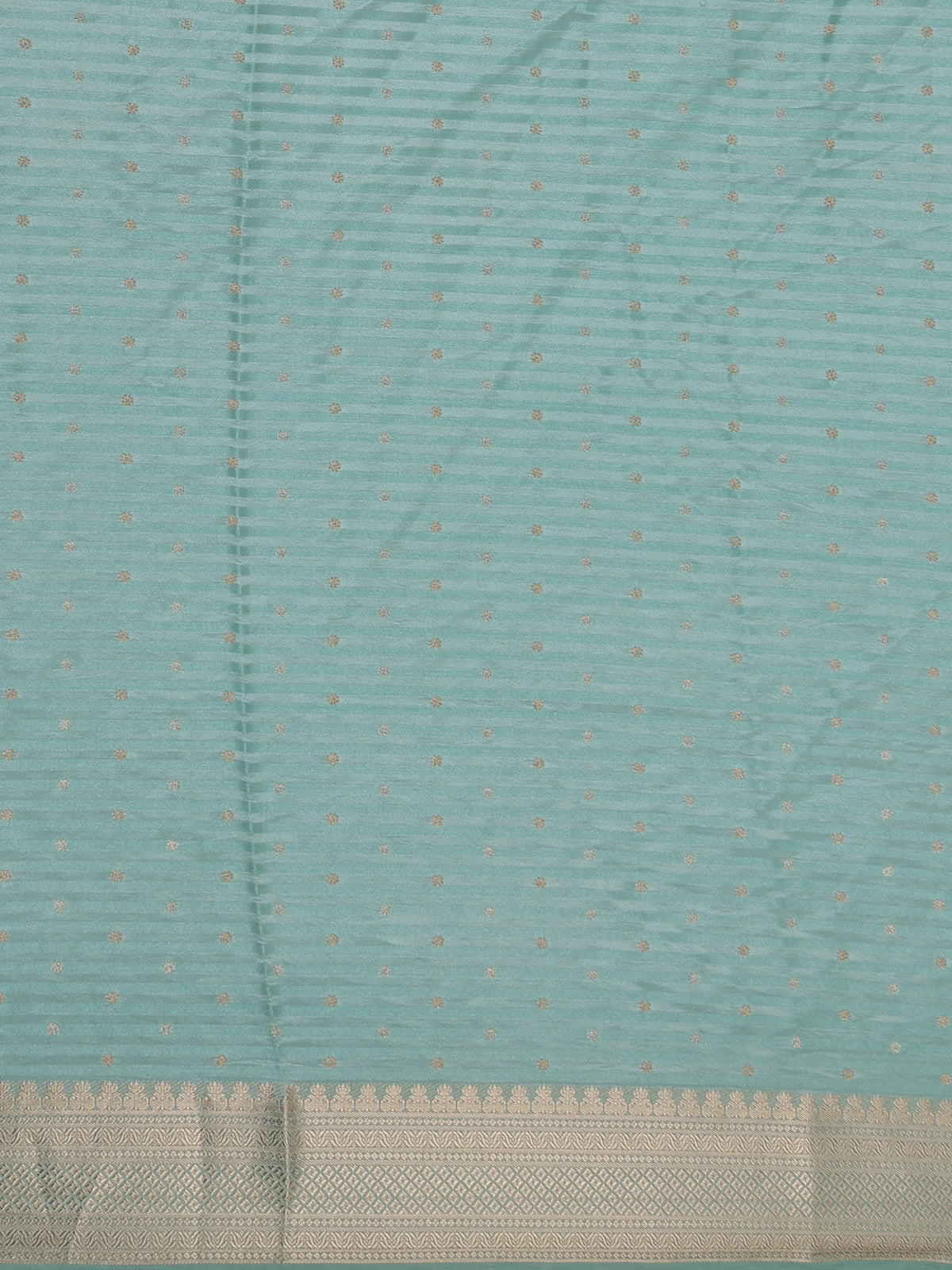 Elegance meets tradition in this stunning Sea Green Semi Banarasi Saree, beautifully designed with subtle horizontal stripes that enhance its graceful texture. The body is adorned with delicate woven butta motifs in shimmering gold, adding a charming festive appeal to the serene sea green tone.