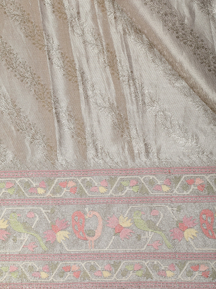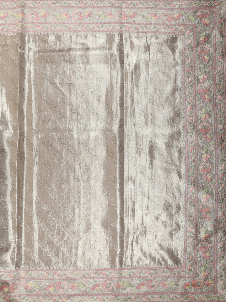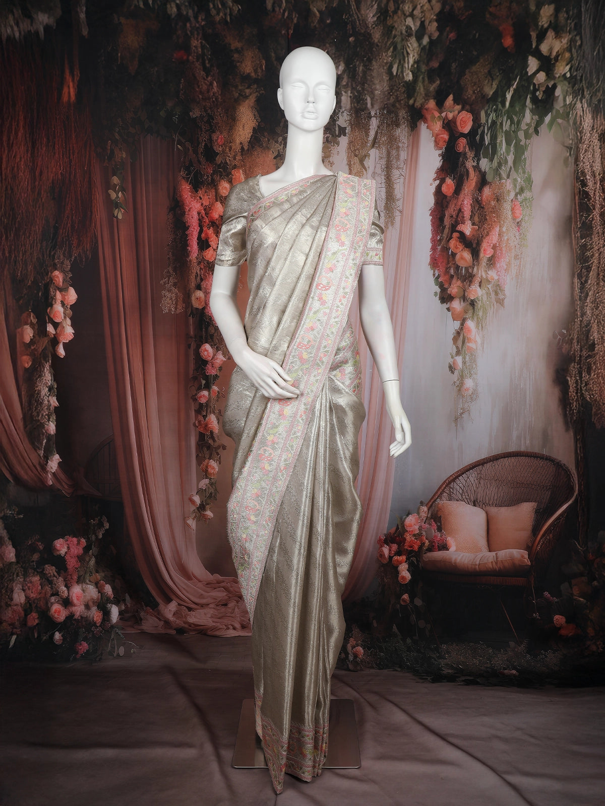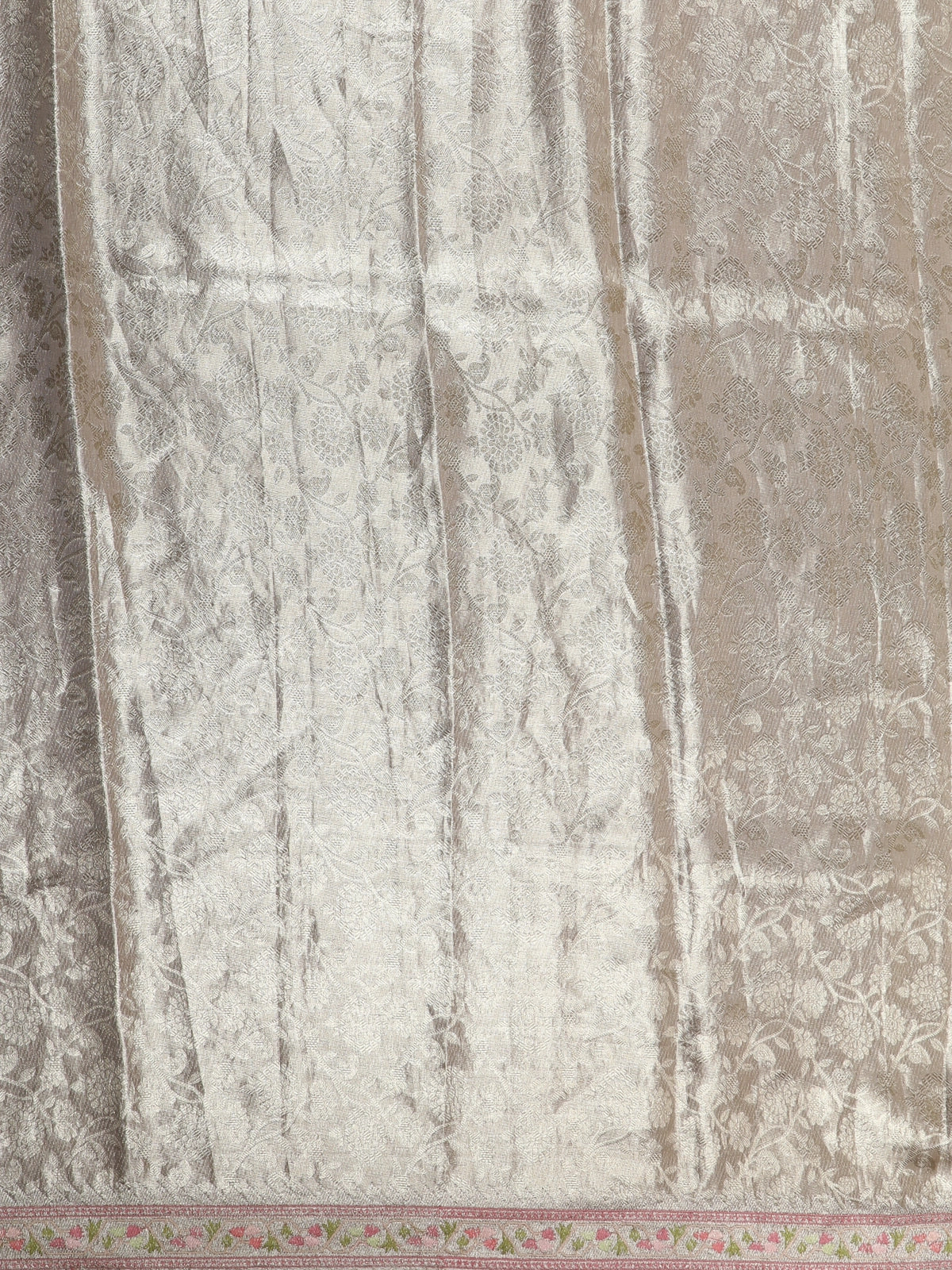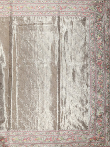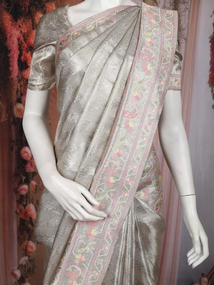 Silver Grey Floral Jacquard Woven Pure Tissue Silk Saree with Pastel Designer Border