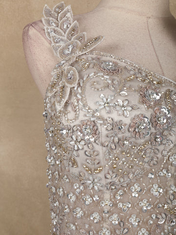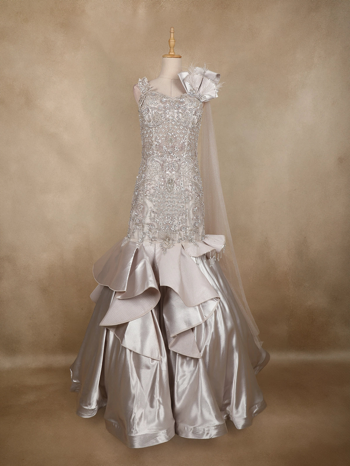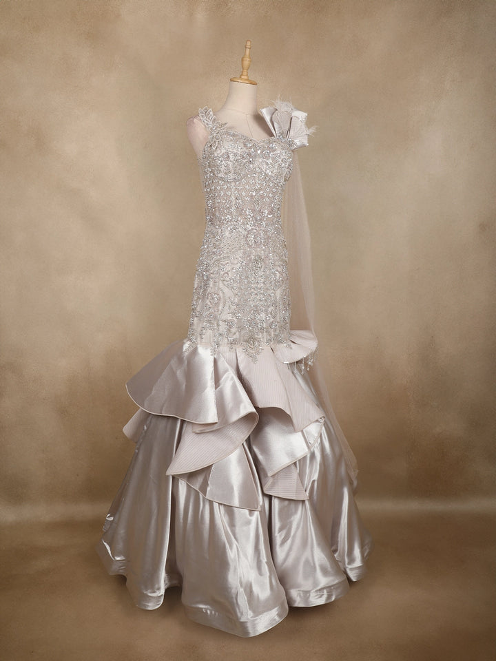 Make an unforgettable entrance with this Silver Sequins and Beads Embellished Net Mermaid Gown, a dazzling creation that perfectly balances glamour and sophistication. Crafted from premium net and satin fabrics, this gown features a lavish display of hand-embroidered sequins, beads, and crystal embellishments, forming intricate floral and geometric patterns that shimmer beautifully under light.