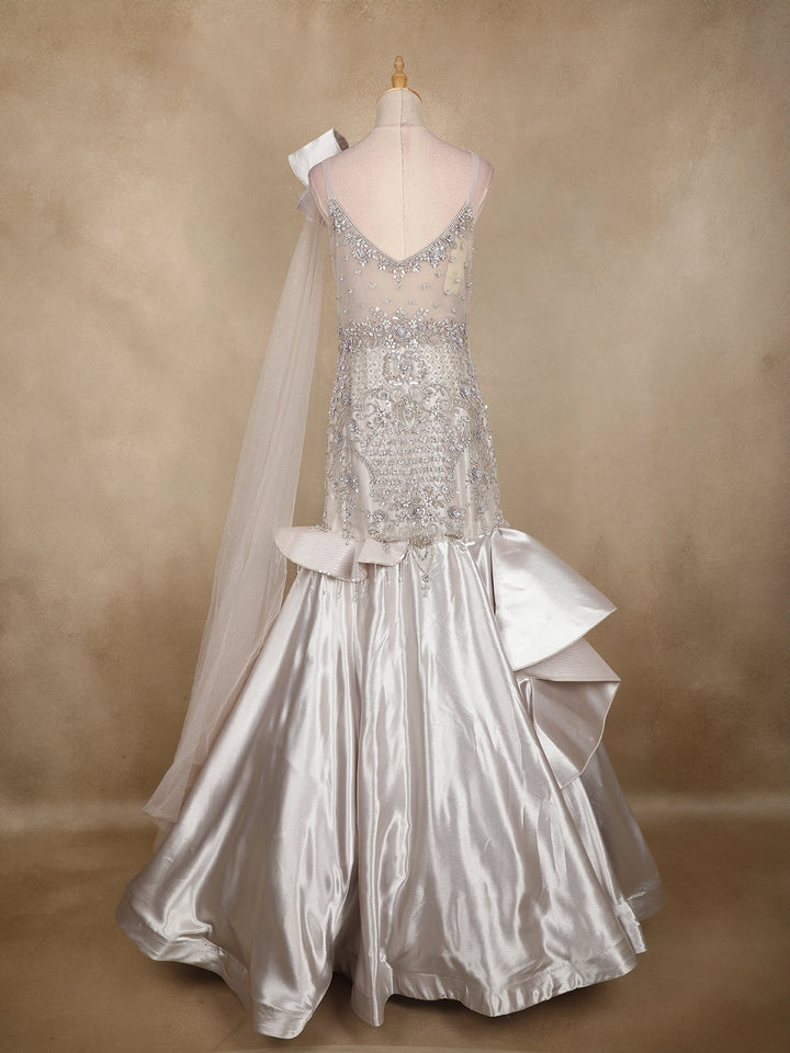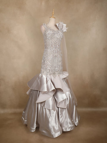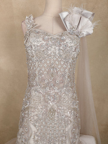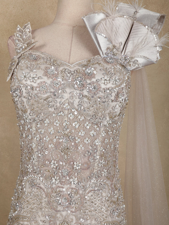 Silver Sequins and Beads Embellished Design Net Mermaid Gown with Shoulder Bow Detail