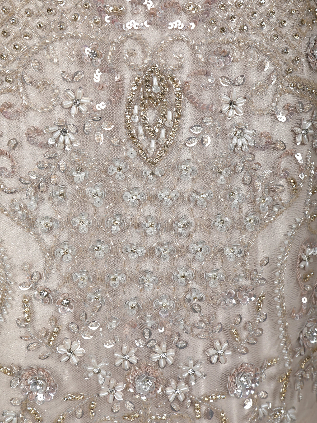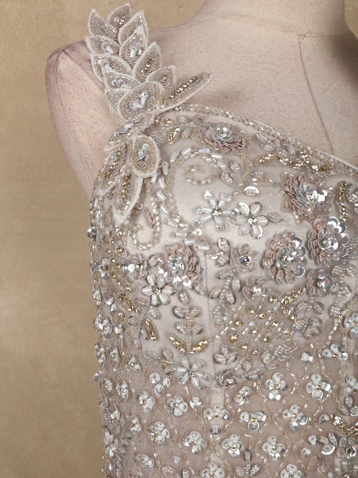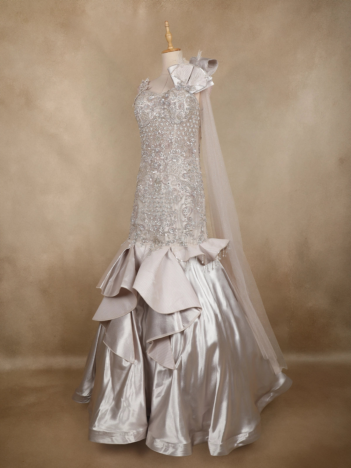 The subtle metallic silver tone exudes royal elegance, making it a perfect choice for receptions, cocktail soirées, or grand evening occasions. Every detail — from the luxurious texture to the handcrafted beadwork — embodies opulence and precision artistry.