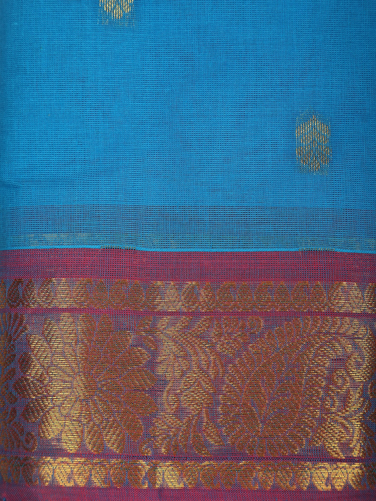 Enhancing its beauty is a contrast magenta border, richly detailed with intricate gold zari floral weaving that lends a traditional South Indian touch. The vibrant border adds depth and character, perfectly balancing the calmness of the sky blue base. Crafted from soft, breathable cotton, this saree offers a smooth drape and exceptional comfort, making it ideal for long hours of wear.