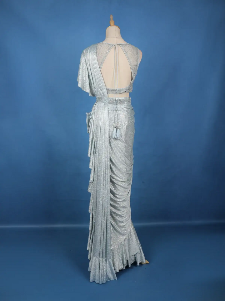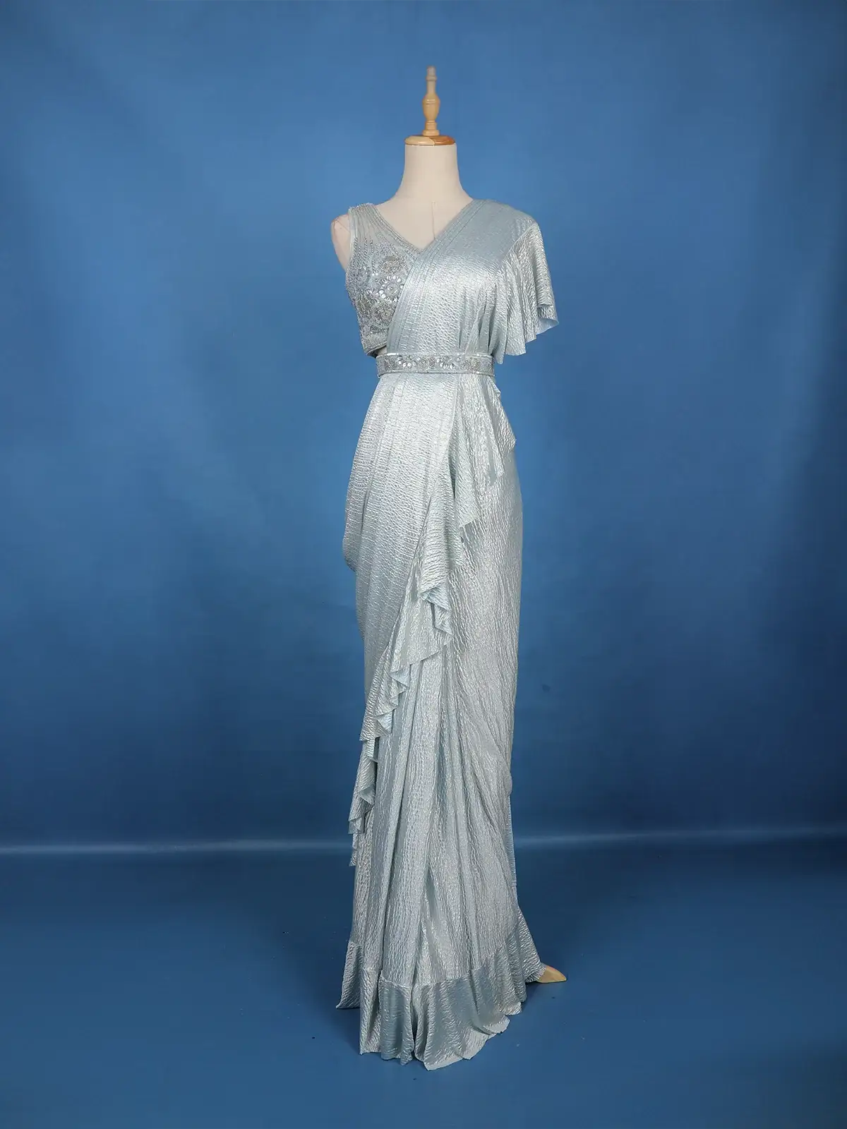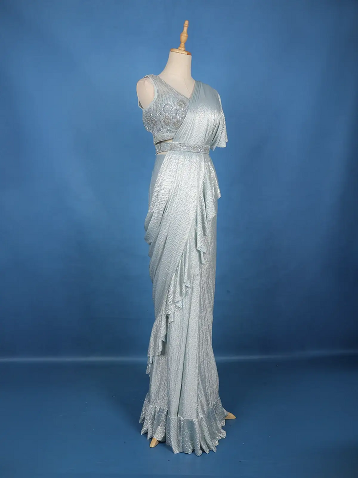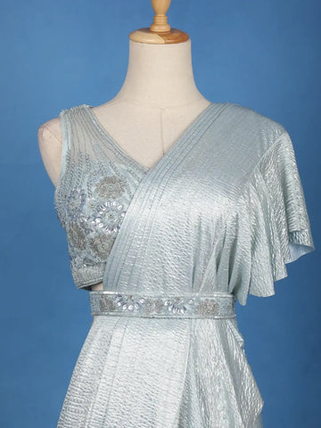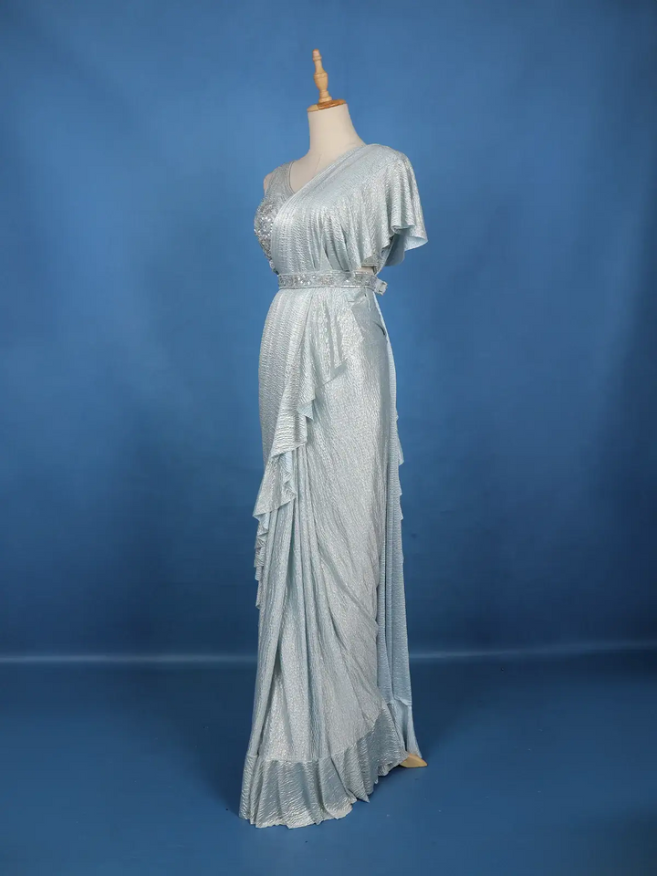 Radiate elegance in this Sky Blue Floral Bead and Sequins Embroidered Shimmer Ready-to-Wear Saree, a masterpiece designed for effortless glamour. Crafted from a luxurious shimmer fabric, the saree features a pre-draped silhouette with cascading ruffles and pleats that flow gracefully, giving you the charm of a traditional saree with the ease of modern wear.