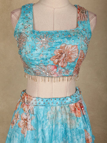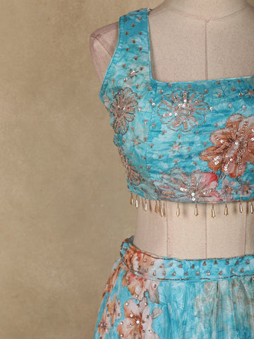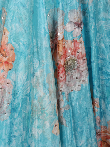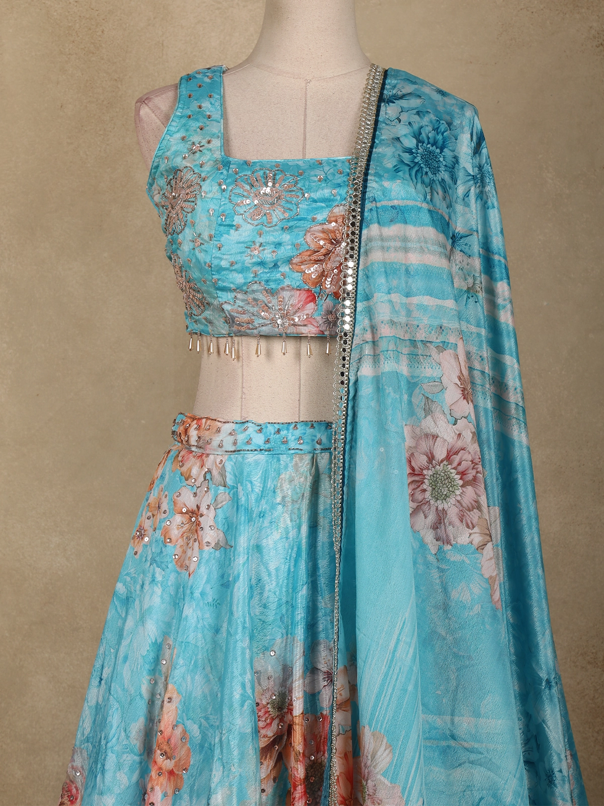 Sky Blue Floral Design Chiffon Lehenga with Dupatta