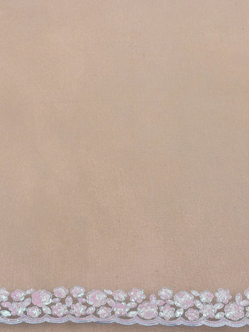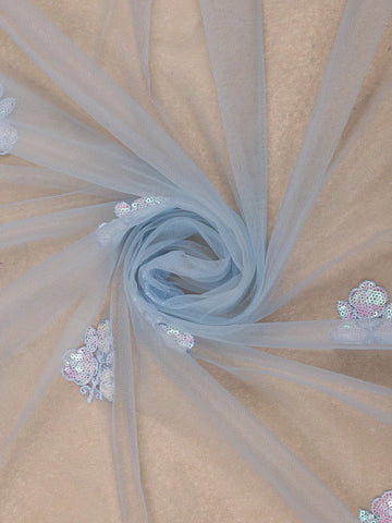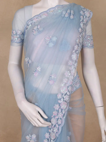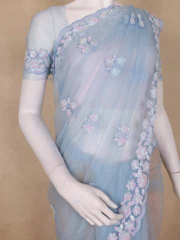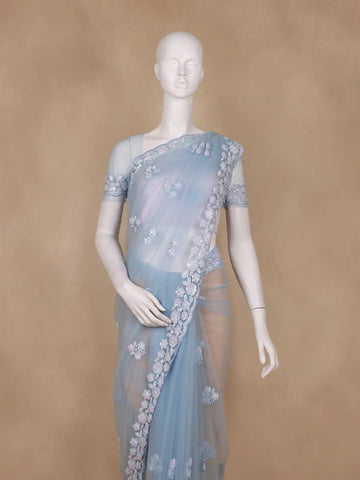The saree is beautifully adorned with intricate floral embroidery, adding depth and sophistication to the sheer blue base. Its finely detailed designer border frames the drape with finesse, enhancing the overall appeal with a luxurious finish.