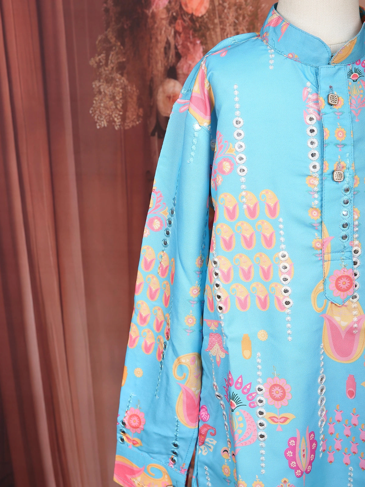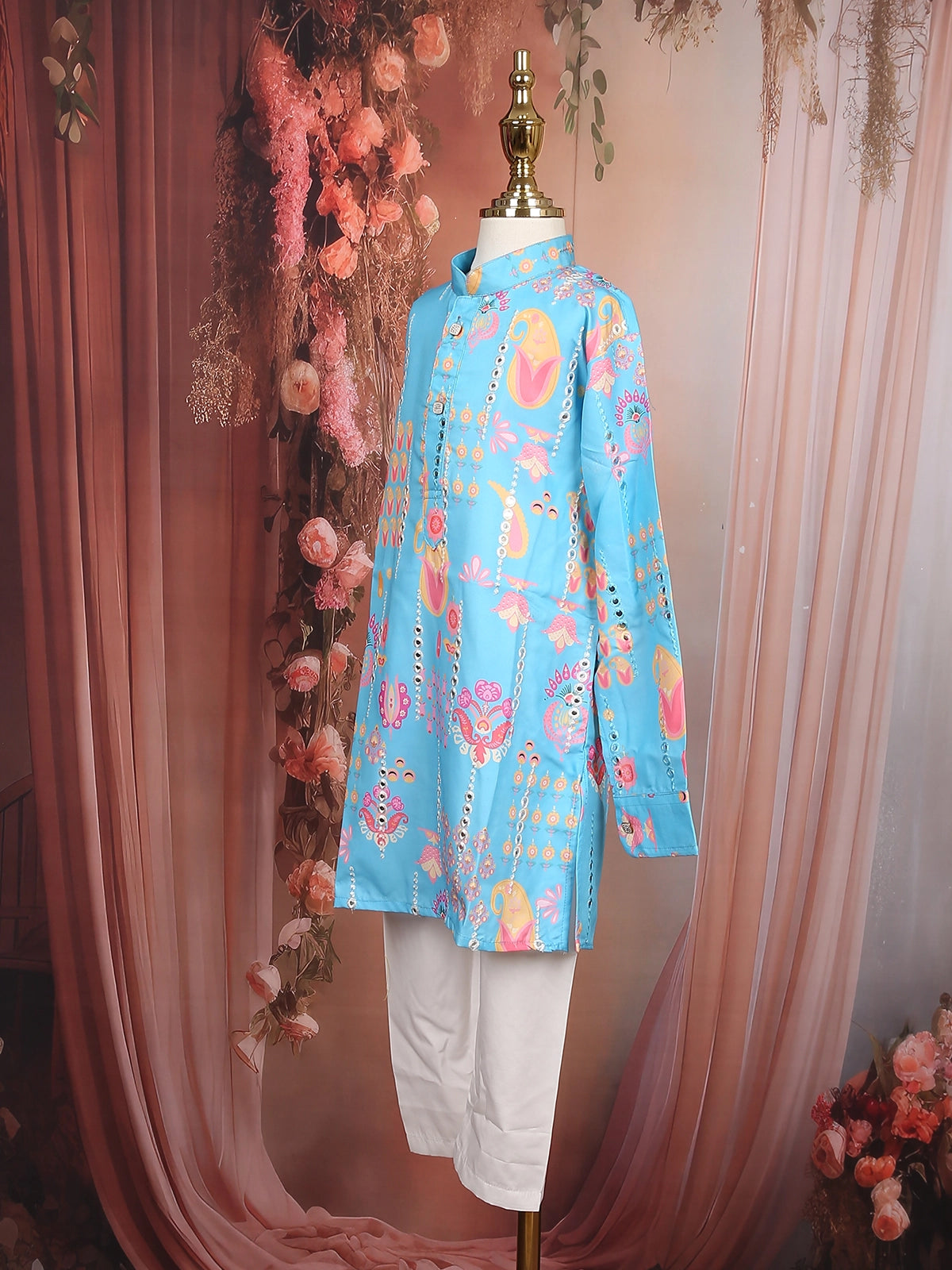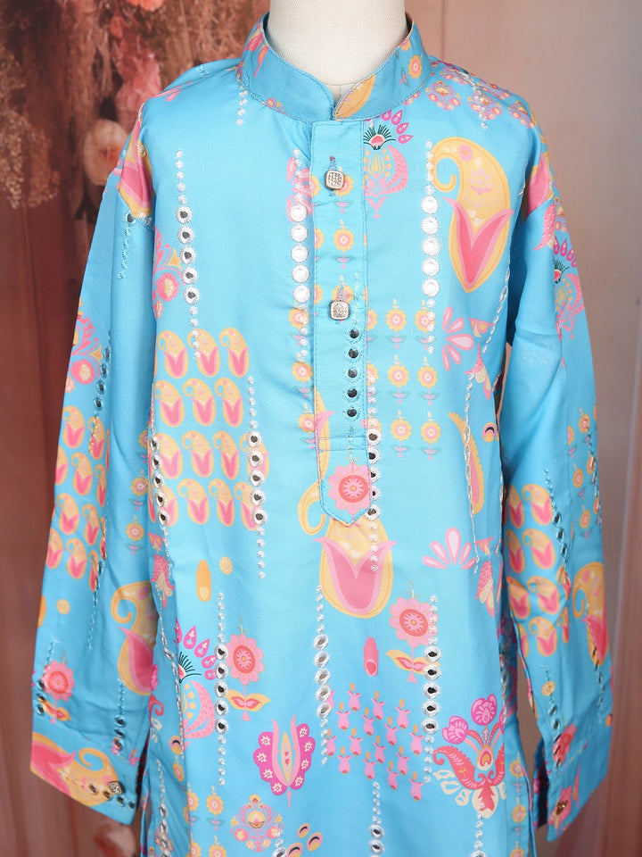 Add a splash of color to your little one’s festive wardrobe with this Sky Blue Multi Motif Printed Kurta Set. Featuring playful ethnic-inspired motifs in vibrant shades, the kurta brings a joyful and charming look perfect for celebrations. The mandarin collar, full sleeves, and button placket offer a neat traditional finish, while the soft fabric ensures superior comfort for active kids.