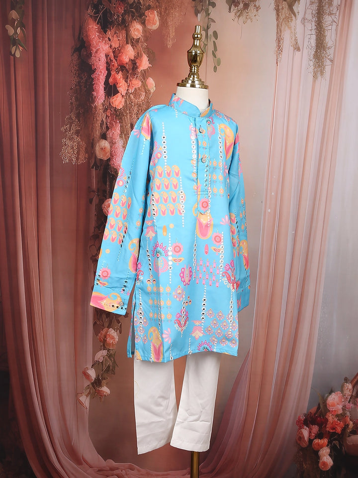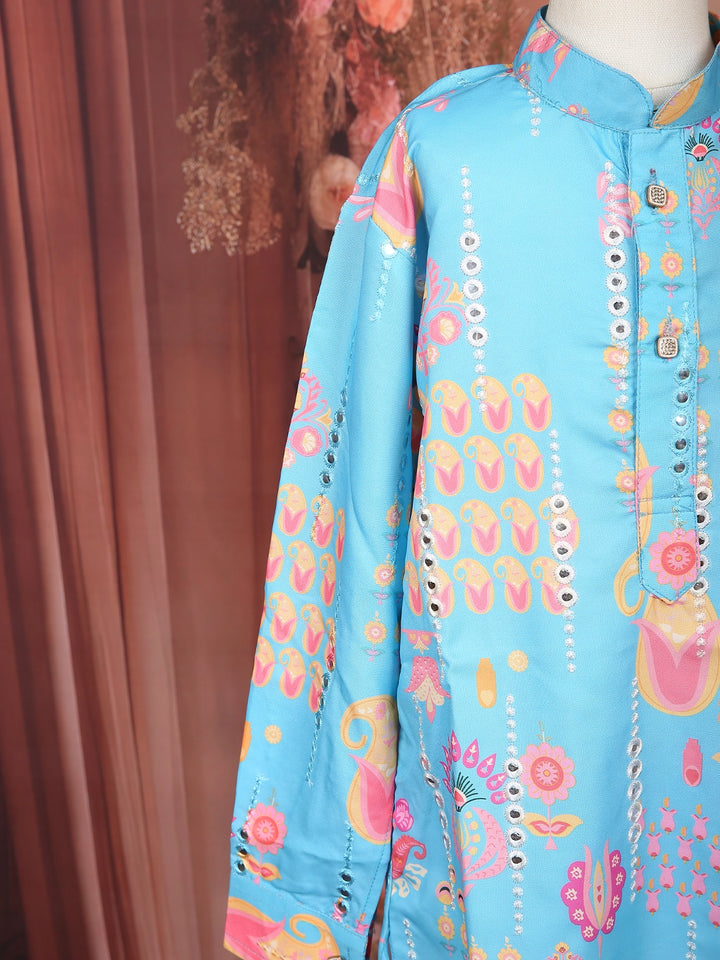 Sky Blue Floral Motif Printed Kids Cotton Kurta Set