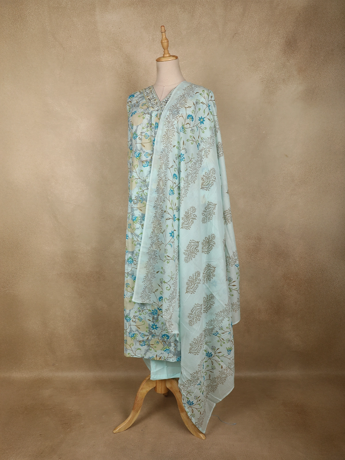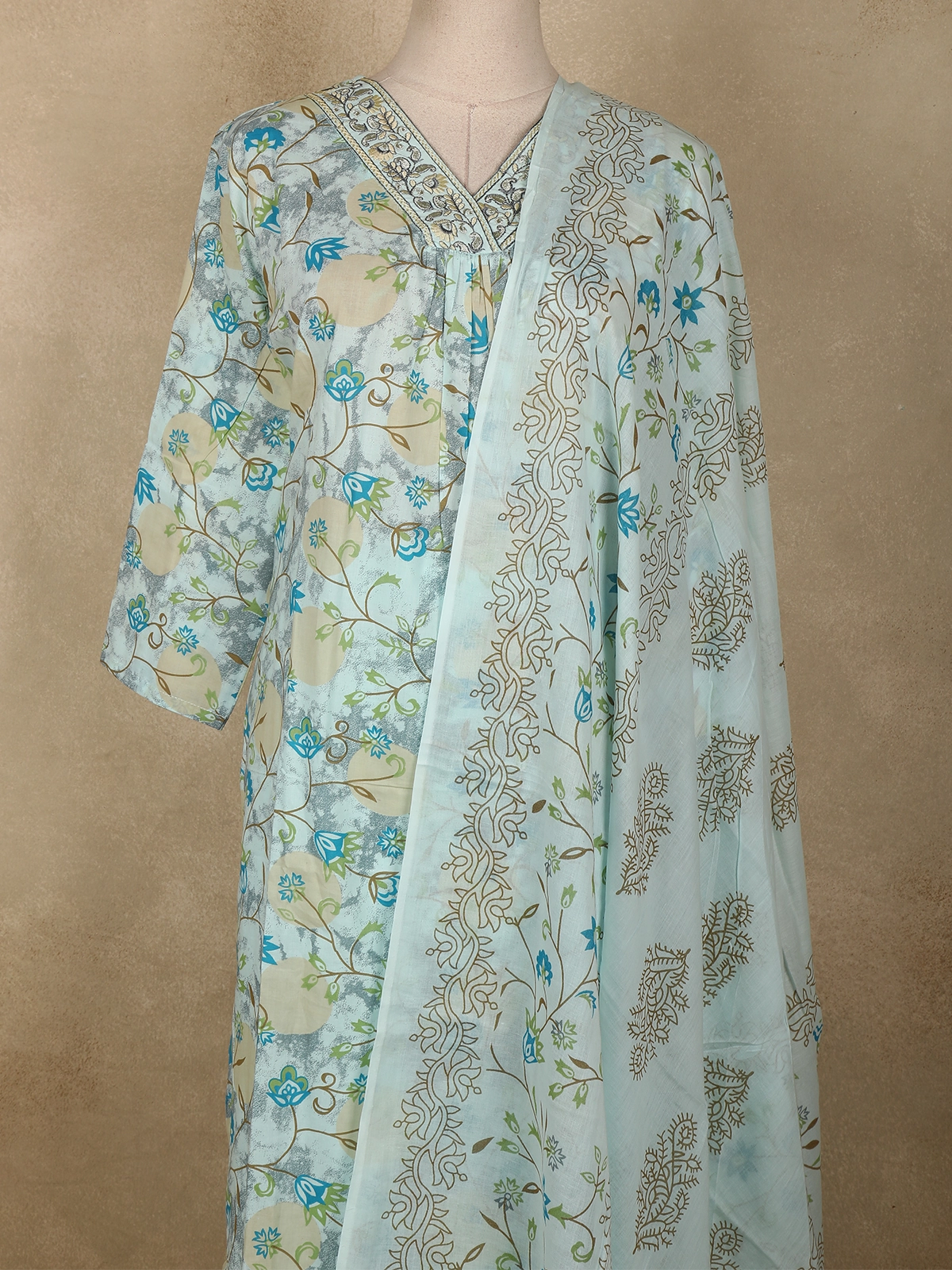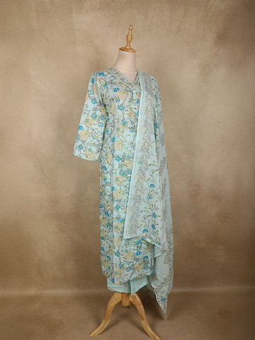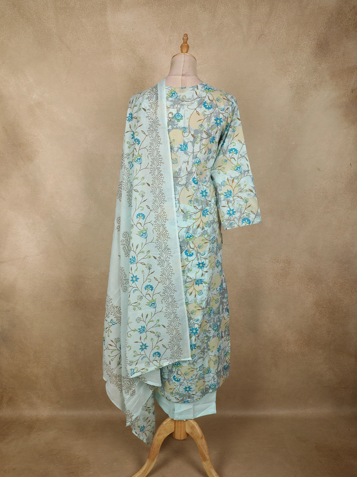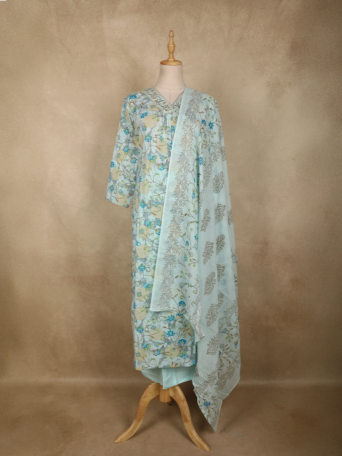 Sky Blue Floral Printed Design Cotton Straight Cut Salwar Suit with Dupatta