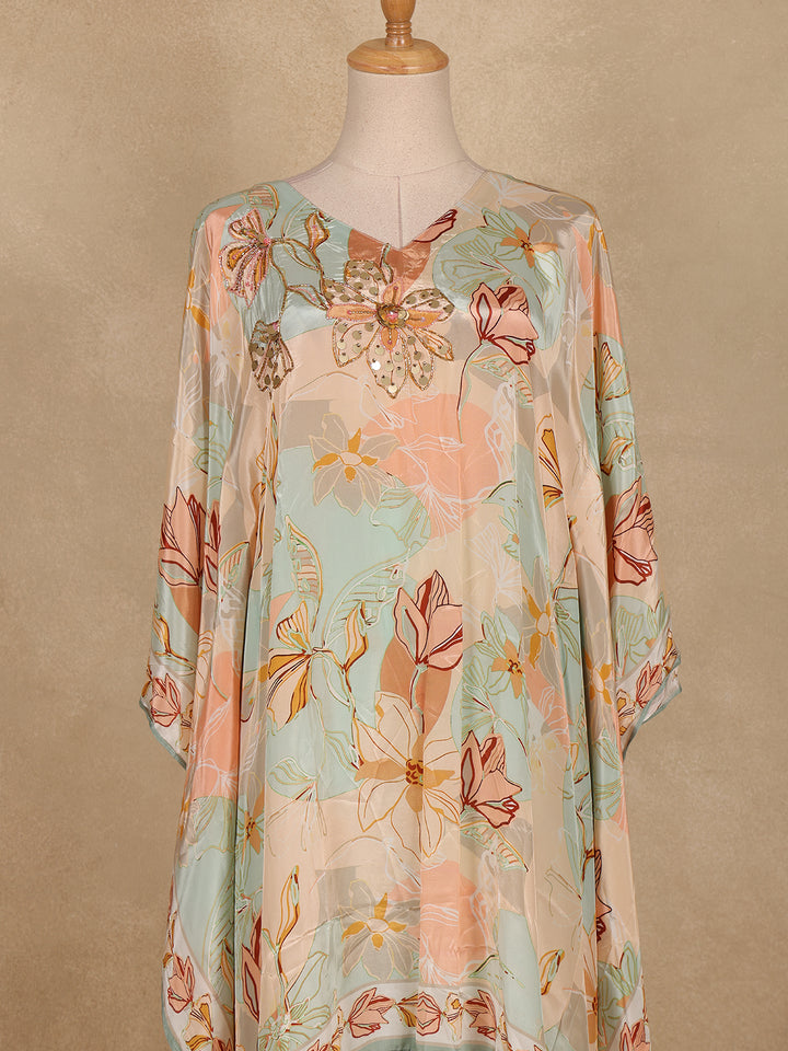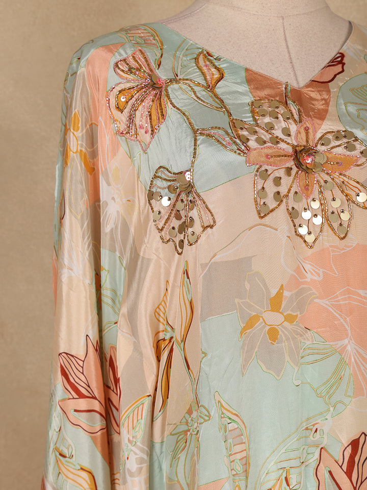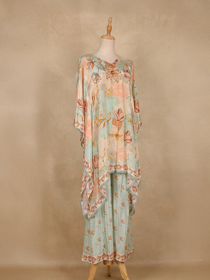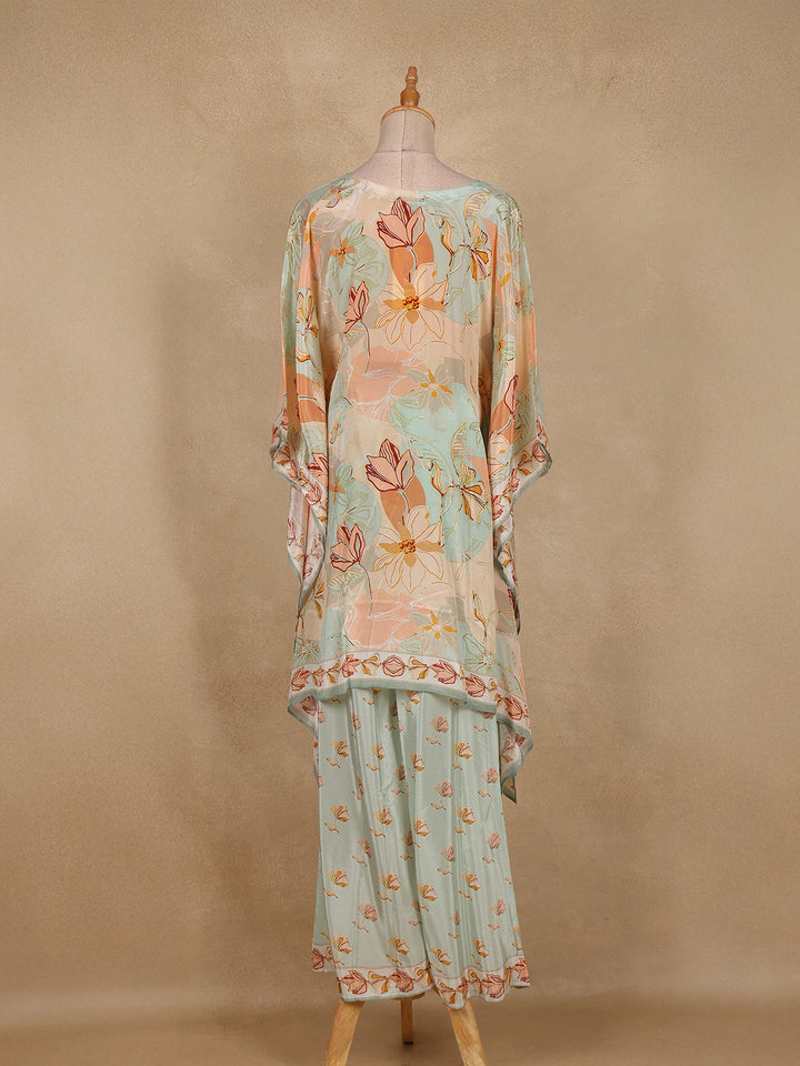 Sky Blue Floral Printed Design Crepe Kaftan Suit