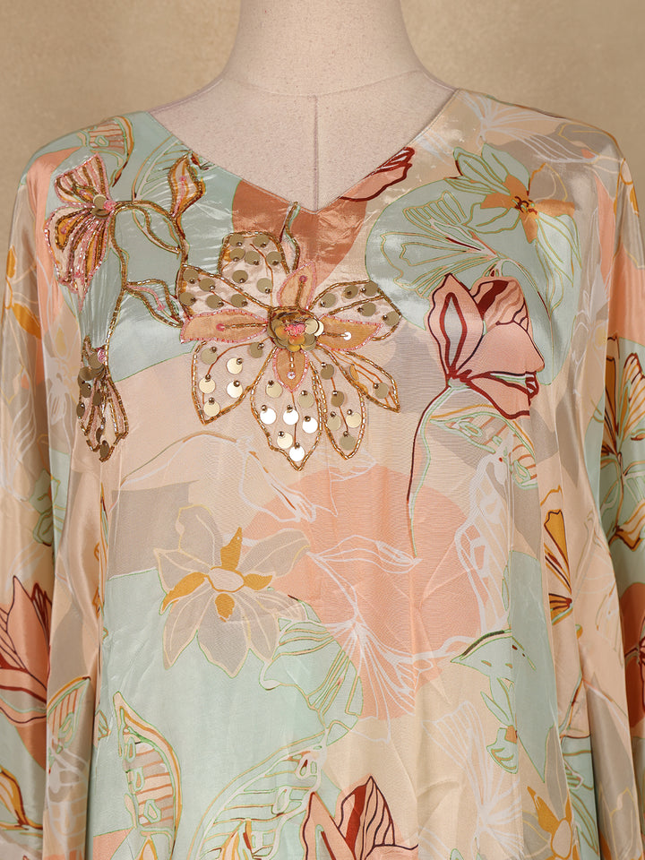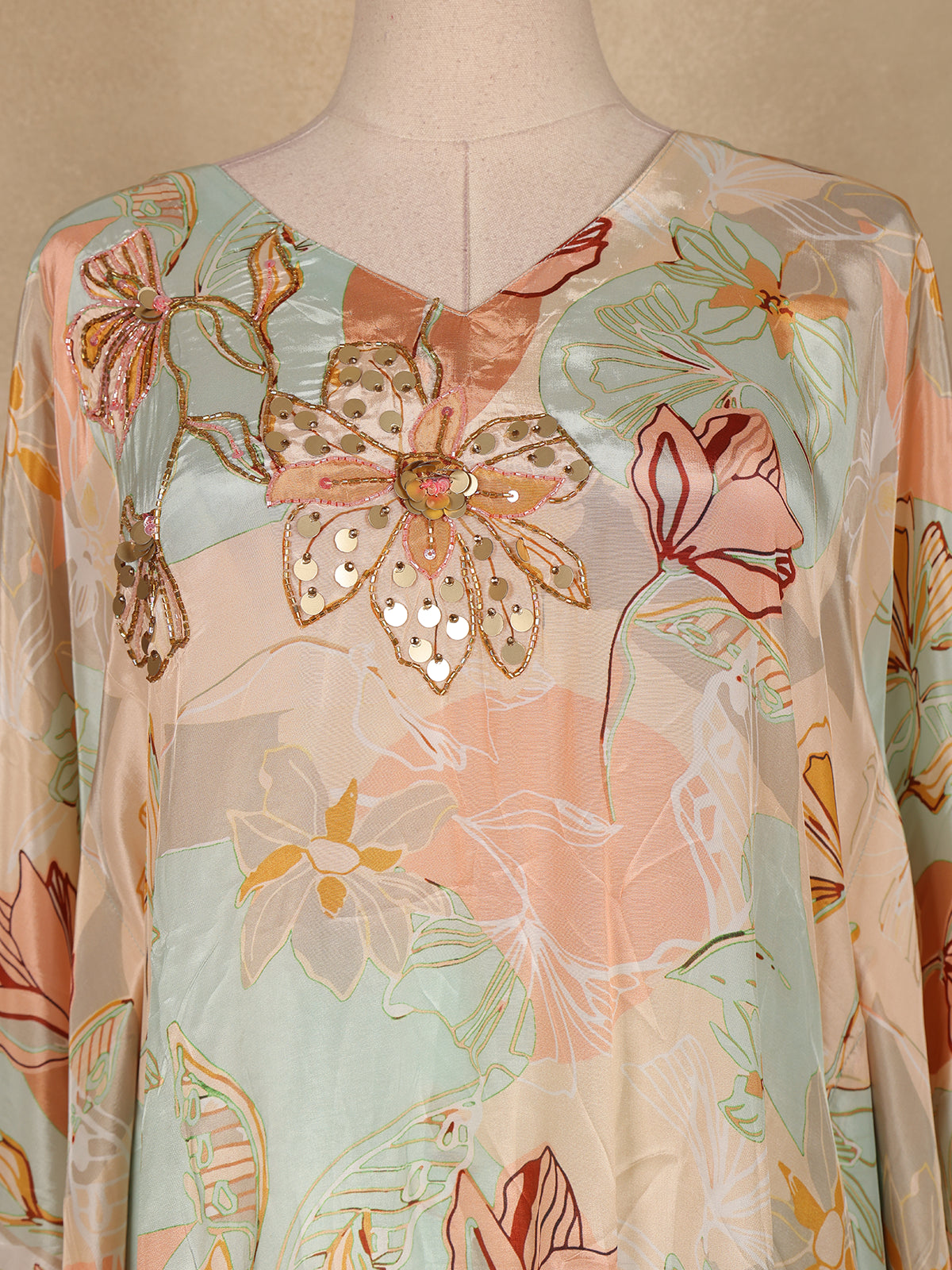 The V-neckline accentuates the neckline beautifully, and the wide kaftan sleeves lend a relaxed yet regal silhouette that ensures both comfort and style. The kaftan-inspired cut allows free movement while maintaining a structured elegance. Designed without a dupatta, this outfit offers a modern, minimalist appeal ideal for contemporary occasions.