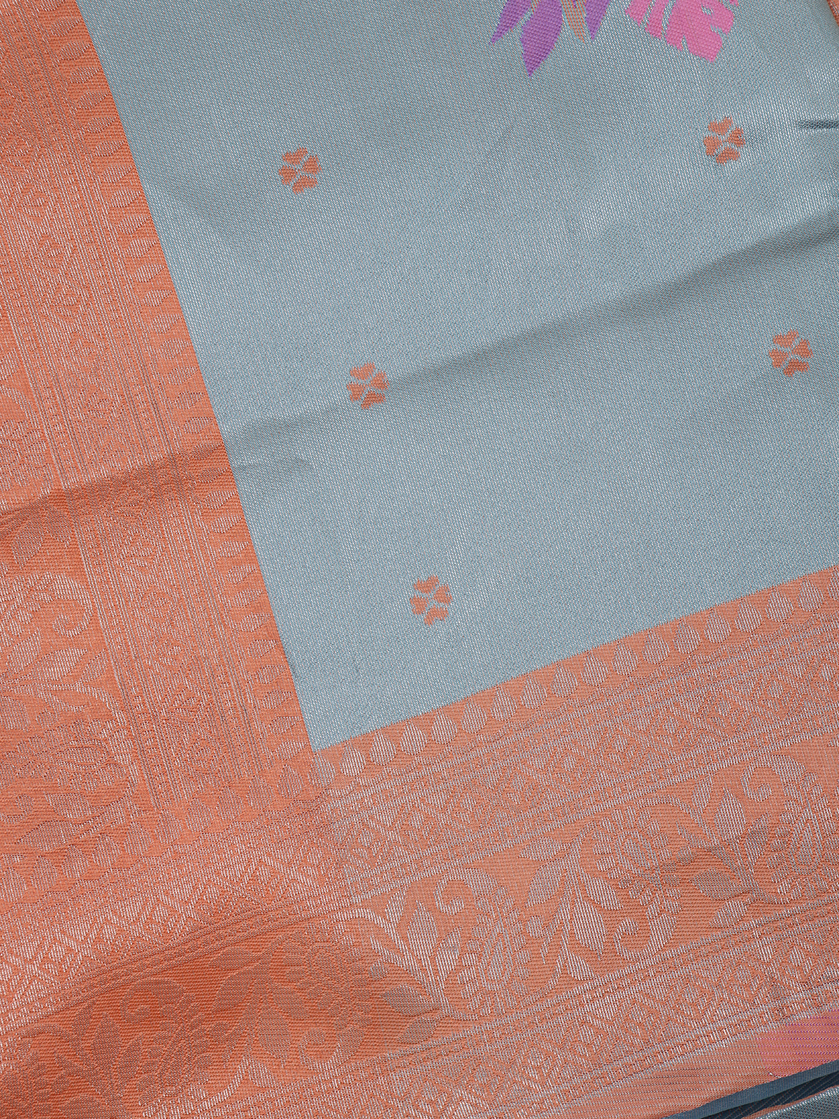 Sky Blue Floral Woven Art Silk Saree with Contrast Peach Zari Border