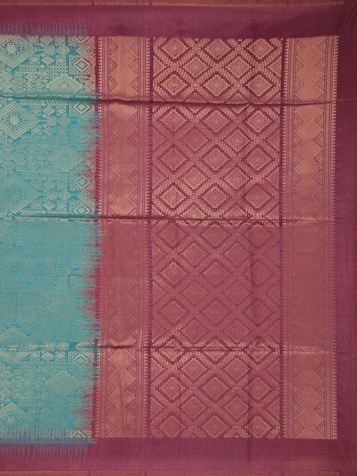 The body of the saree showcases striking abstract weave designs, artfully blended into the fabric to create a subtle play of patterns and texture. These abstract motifs bring a sense of movement and artistic flair to the serene sky blue base, lending a fresh, modern edge to a classic silhouette.