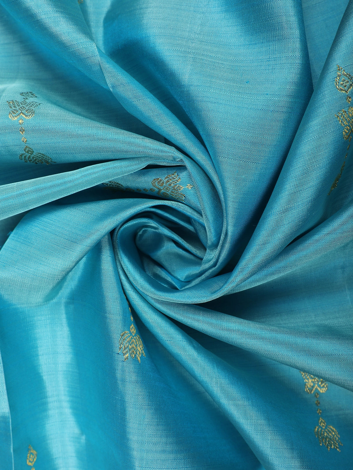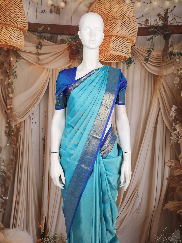 Immerse yourself in timeless elegance with this Sky Blue Pure Kanchipuram Silk Saree, exquisitely crafted to reflect the grandeur of South Indian weaving traditions. The saree features delicate zari woven motifs scattered gracefully across the lustrous silk body, adding a subtle shimmer that enhances its regal allure.