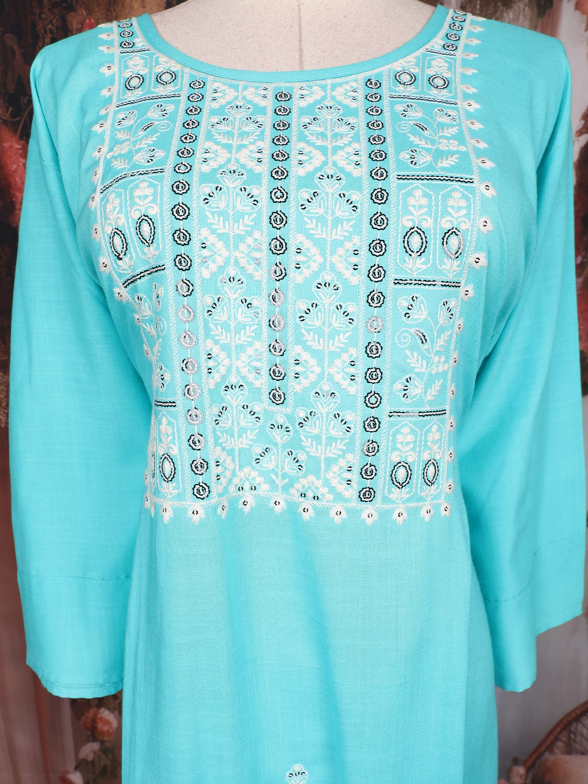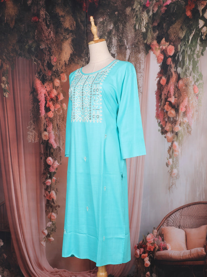 Refresh your everyday ethnic collection with this Sky Blue Thread Embroidered Cotton Kurti, a timeless piece that combines grace, comfort, and subtle elegance. Made from soft, breathable cotton fabric, this kurti ensures all-day comfort while keeping your look effortlessly refined.