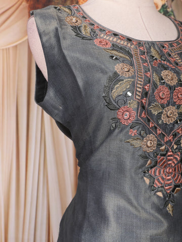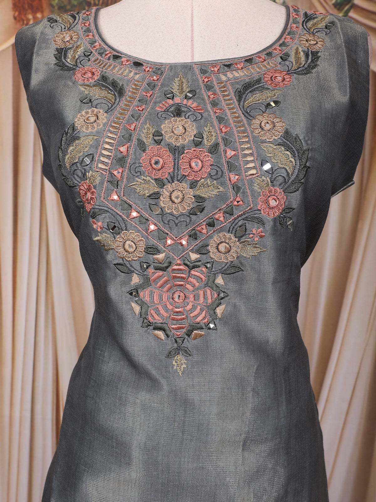 Step into elegance with this refined Slate Blue Tissue Silk Palazzo Suit, a perfect ensemble for festive and celebratory occasions. The kurta is beautifully adorned with floral embroidery in complementary hues, accentuated with delicate thread and sequin detailing that adds a graceful shimmer against the smooth tissue silk fabric. The subtle sheen of the material enhances the richness of the design, creating a luxurious drape with every move.