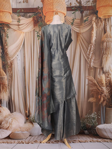 Slate Blue Floral Embroidered Design Tissue Silk Palazzo Suit with Printed Dupatta