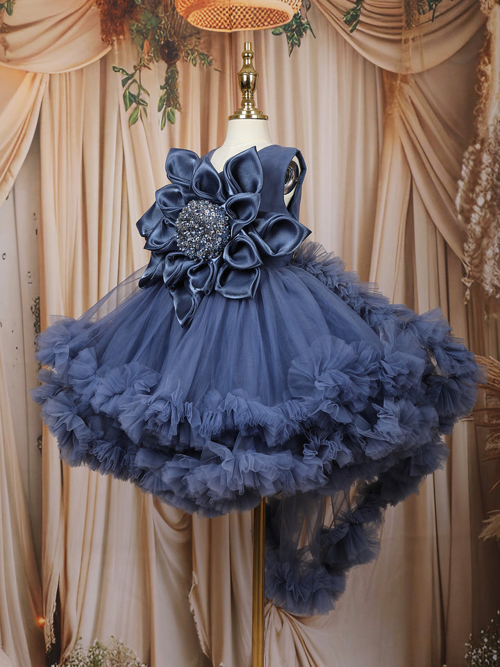 Let your little one sparkle like a star in this stunning Slate Blue Floral Layered Net Ruffle Frock, crafted to bring out her inner princess. The frock features a captivating oversized 3D floral appliqué at the bodice, artistically designed with satin petals and a shimmering sequin-embellished centerpiece, adding a touch of glamour and uniqueness to the outfit.
