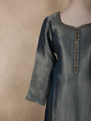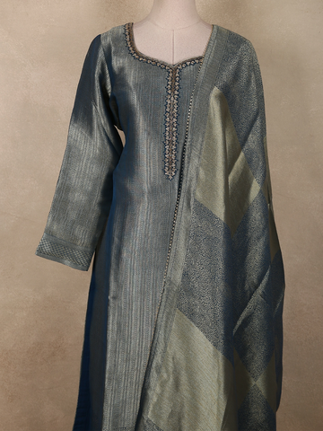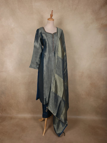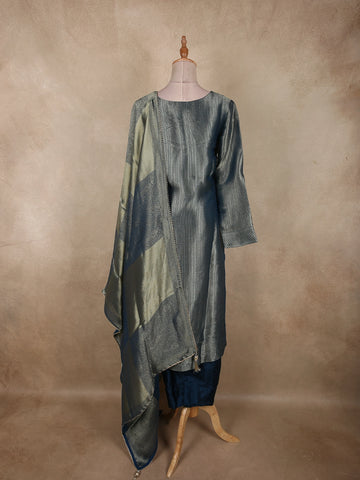 Refined and effortlessly elegant, this Slate Blue Zari Woven Design Tissue Straight Cut Salwar Suit with Dupatta is crafted for understated festive sophistication. The ensemble is rendered in a graceful slate blue tone with soft olive undertones, lending depth and a calm, contemporary charm to the look.