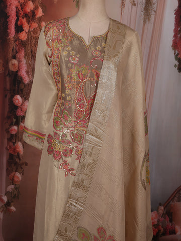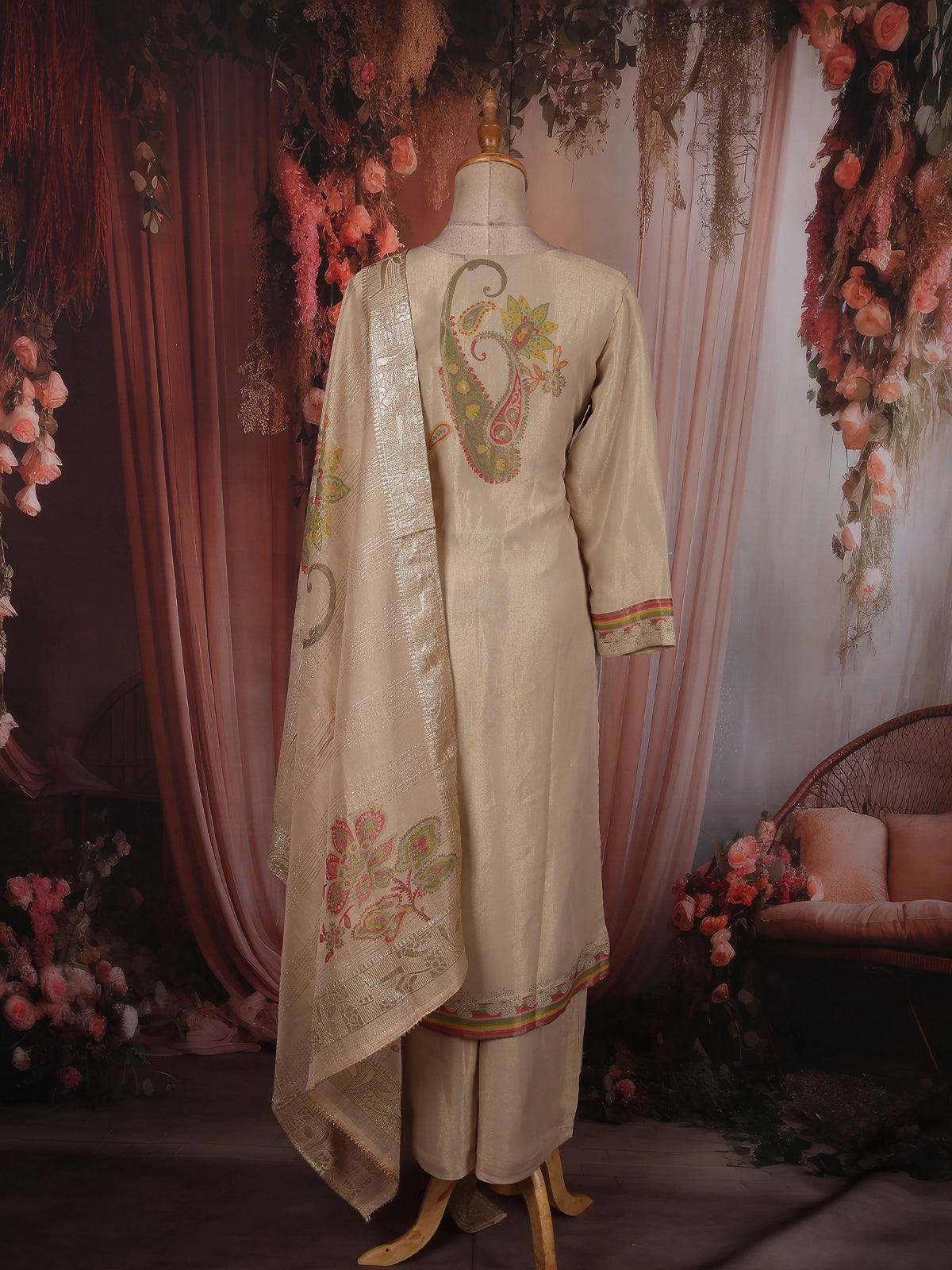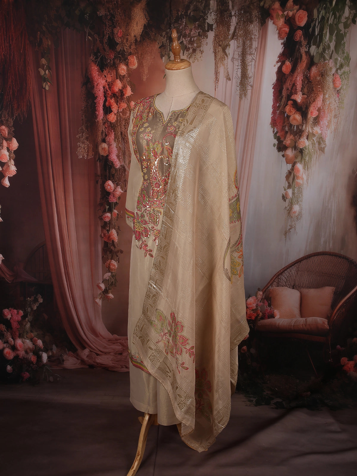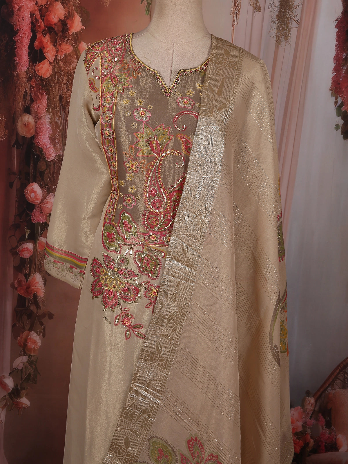 Soft Antique Beige Gold Floral Sequins and Beads Embroidered Design Tissue Silk Palazzo Suit with Dupatta