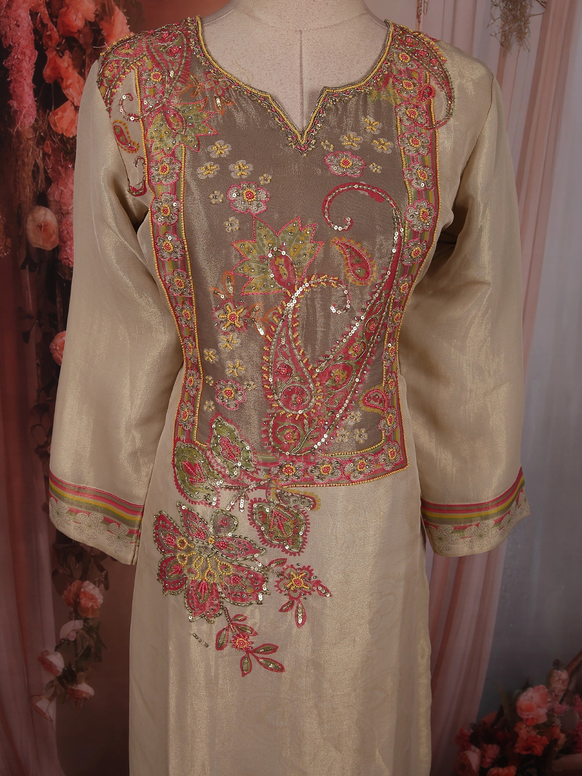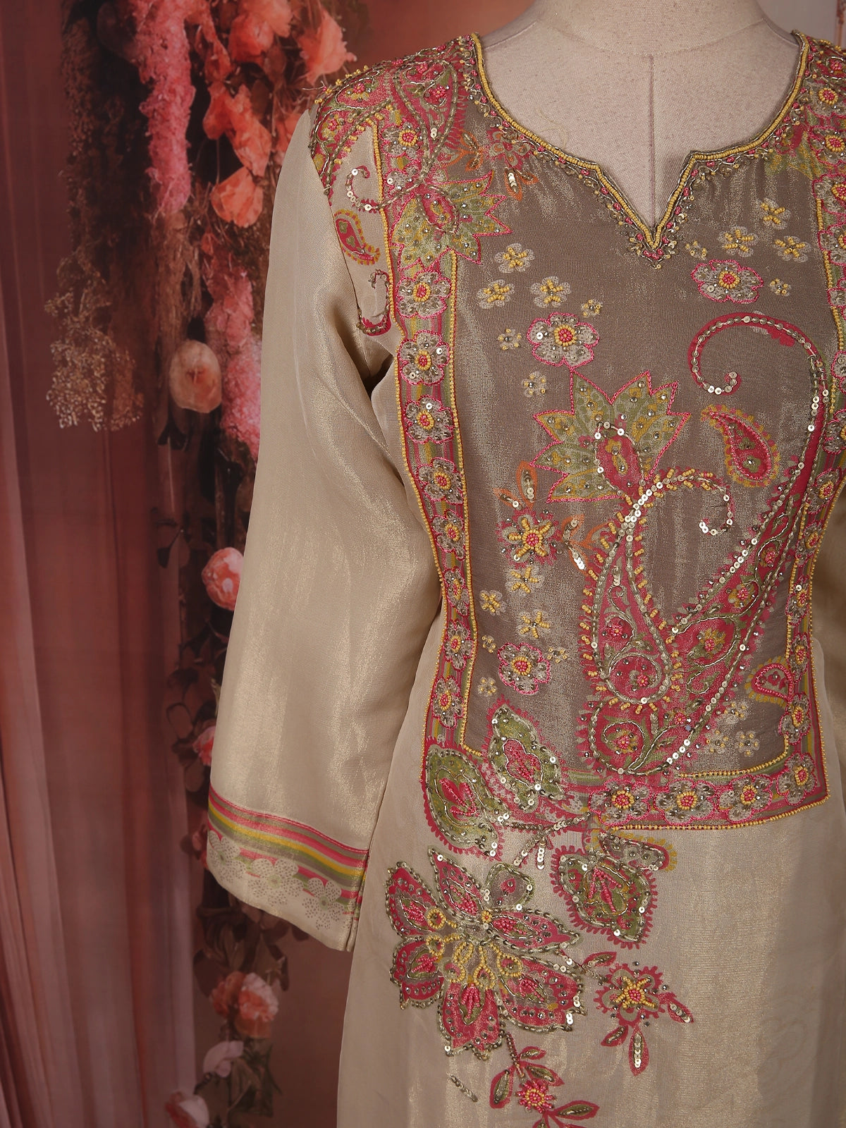 The kurta features intricate floral sequins and bead embroidery across the yoke and front panel, delicately crafted in soft pink and green accents that add depth and vibrancy to the neutral base. The detailed neckline and finely finished sleeve borders elevate the ensemble with refined artistry. The smooth tissue silk fabric offers a fluid fall, ensuring a flattering and sophisticated silhouette.