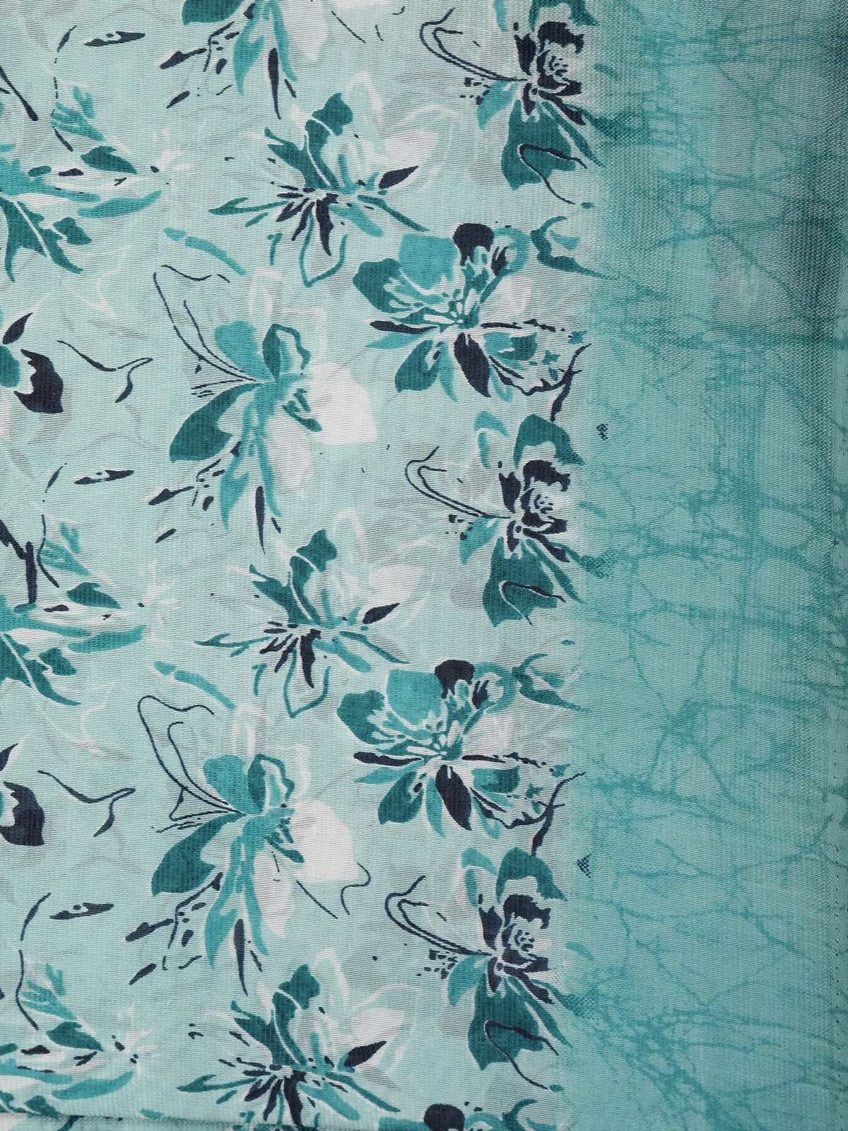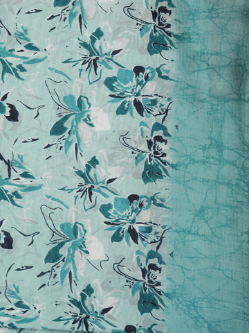 Delicate floral printed motifs in layered shades of teal, sea green, ivory, and subtle charcoal accents flow beautifully across the saree, adding depth and artistic character. Crafted from smooth crepe silk, the fabric offers a lightweight texture with a fluid, elegant drape that enhances comfort while maintaining a polished silhouette.