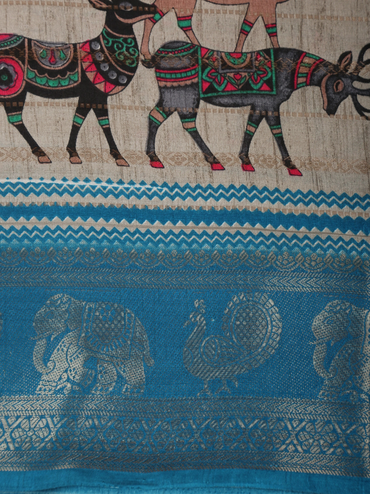 Soft Ash Grey Deer Motif Printed Design Semi Silk Saree with Teal Blue Animal Motif Border