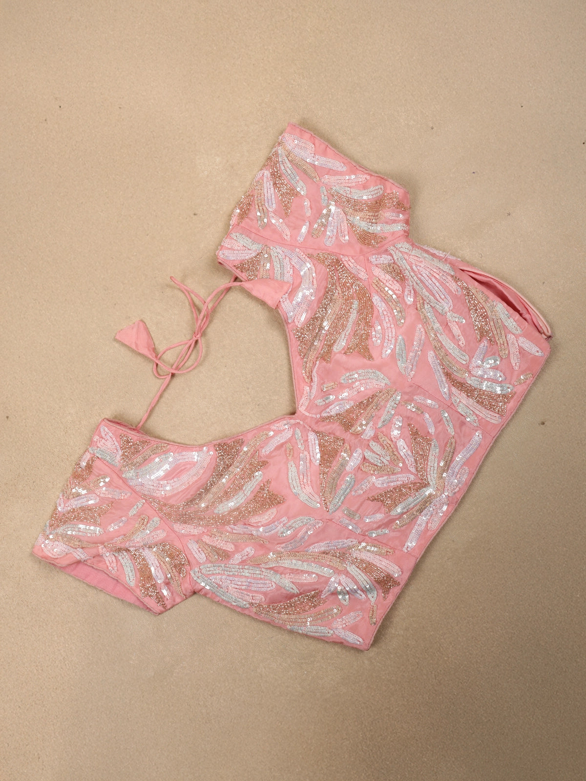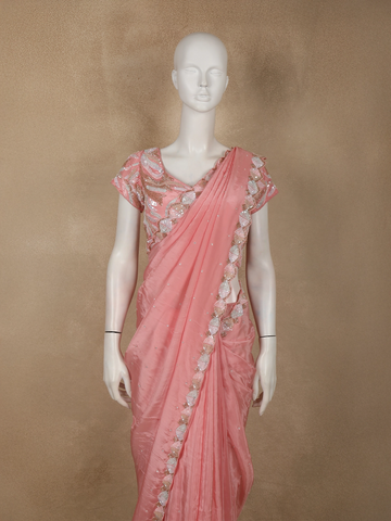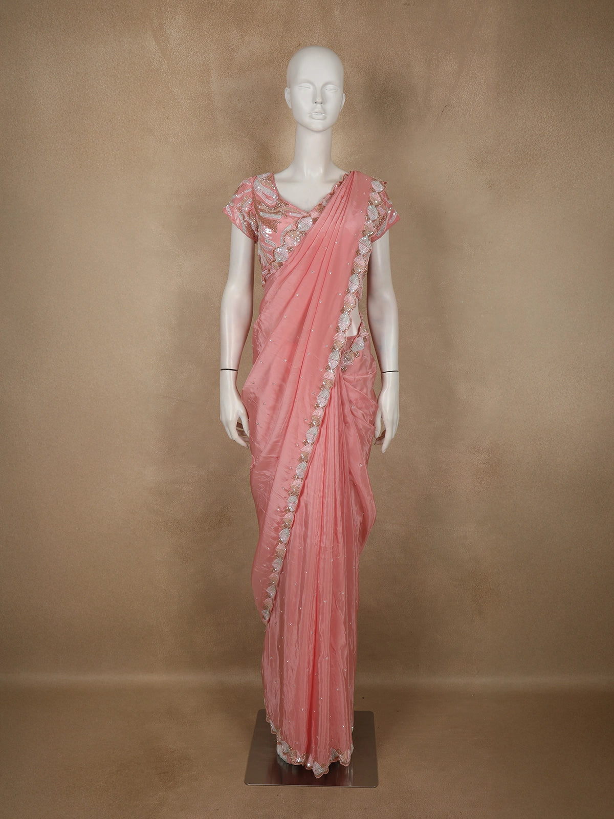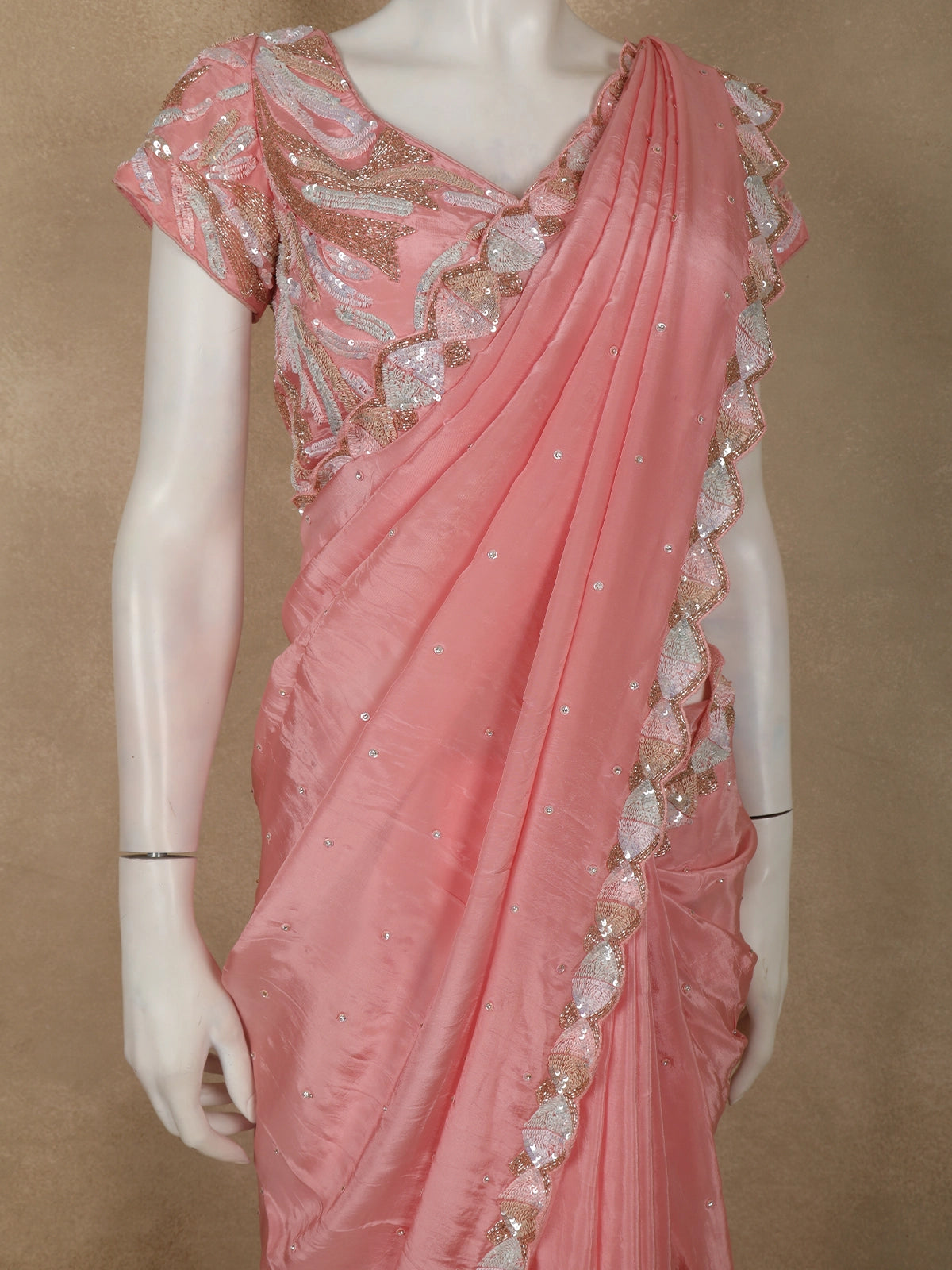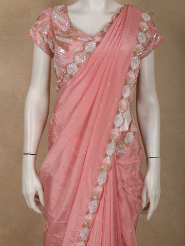 Soft Blush Peach Pink Heavy Sequins and Beads Embroidered Design Satin Saree with Matching Blouse