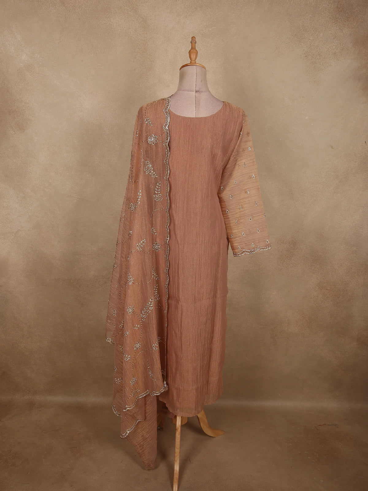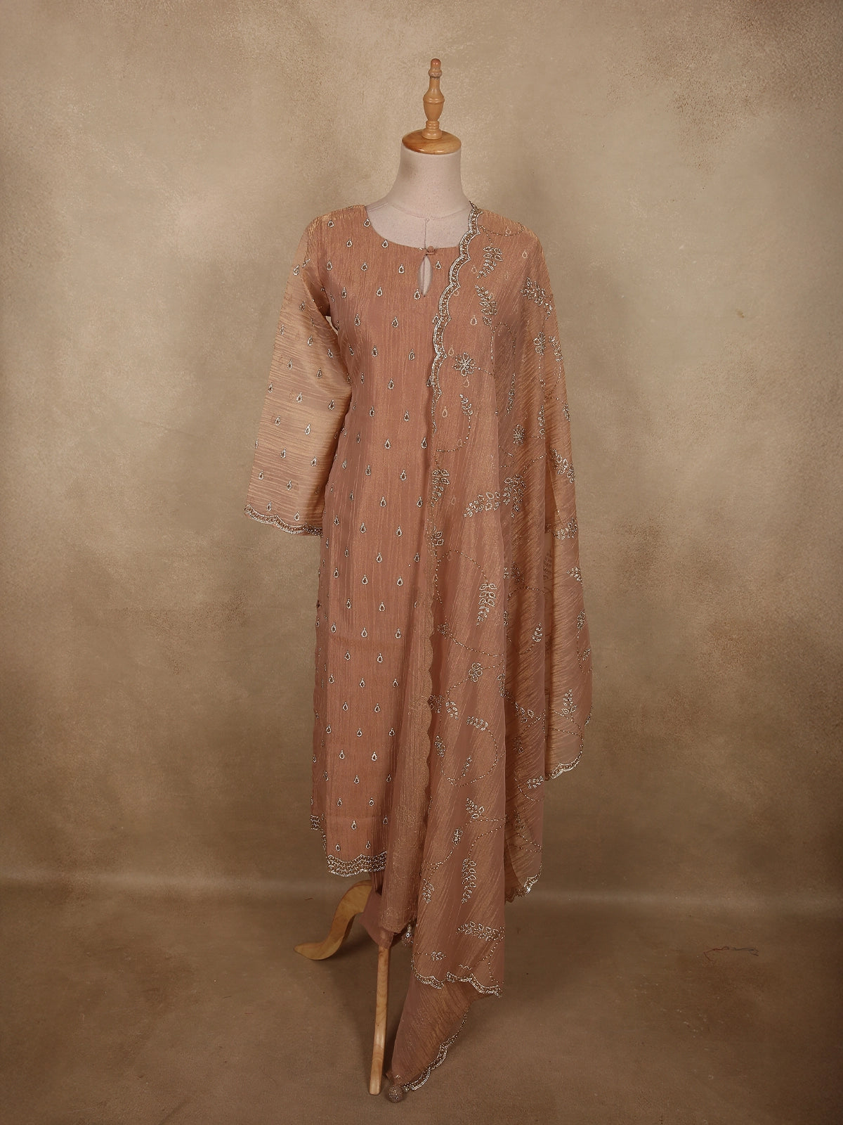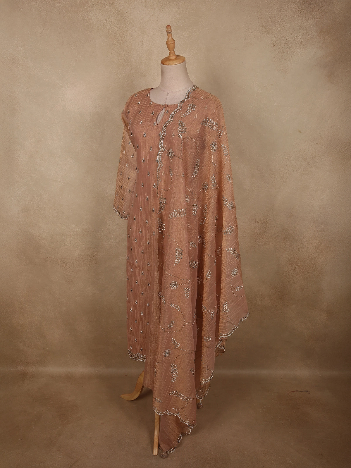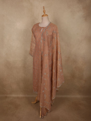 Soft Caramel Peach Silver Beads Embroidered Design Tissue Silk Salwar Suit