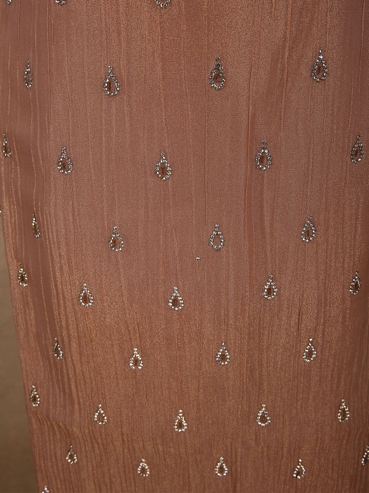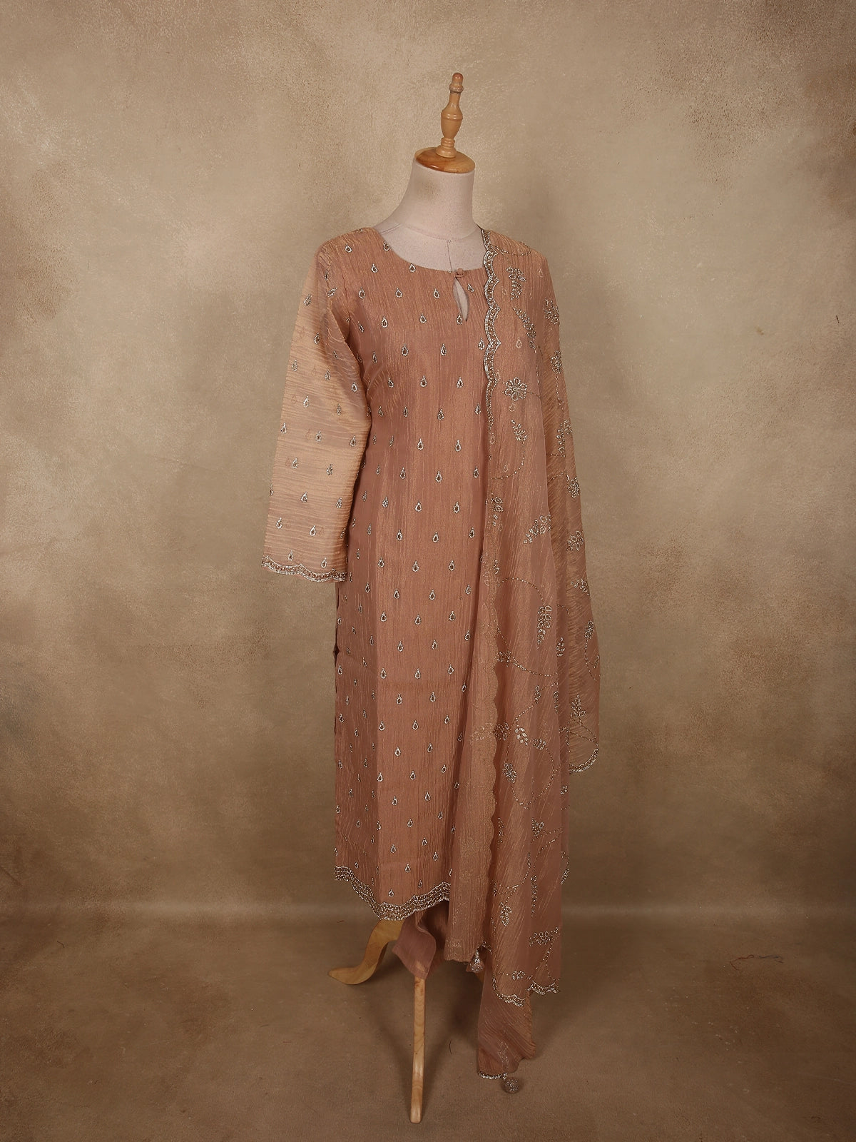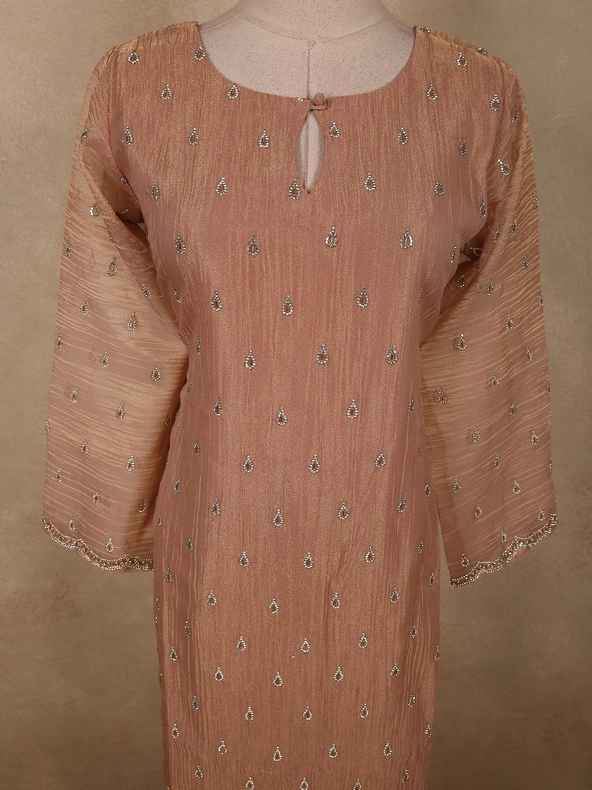 Soft Caramel Peach Silver Beads Embroidered Design Tissue Silk Salwar Suit