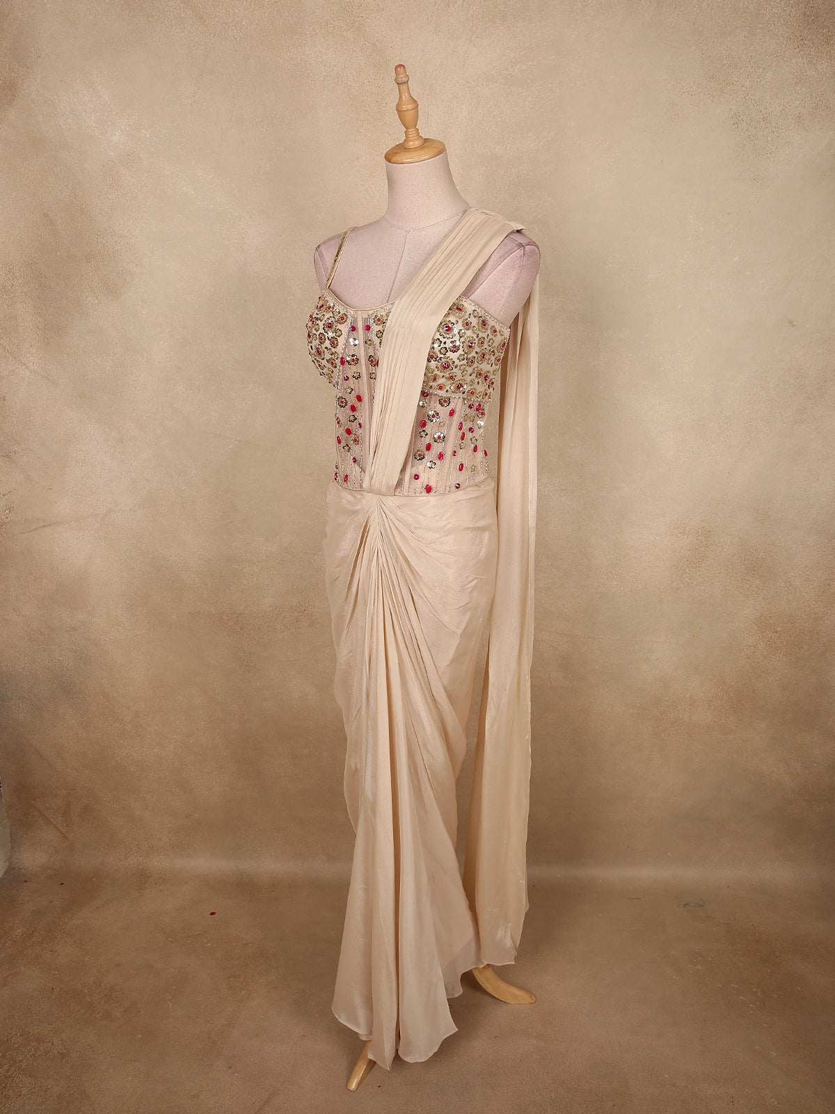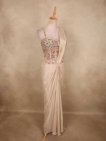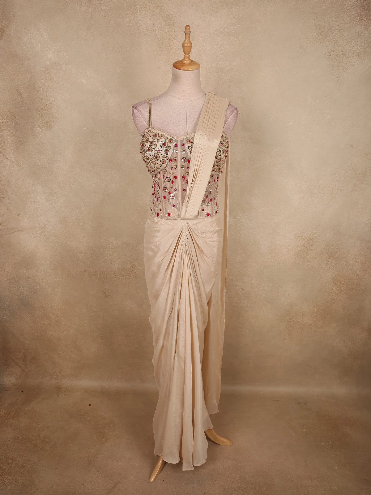 Soft Champagne Beige Floral Sequins and Beads Embroidered Design Georgette Ready To Wear Saree