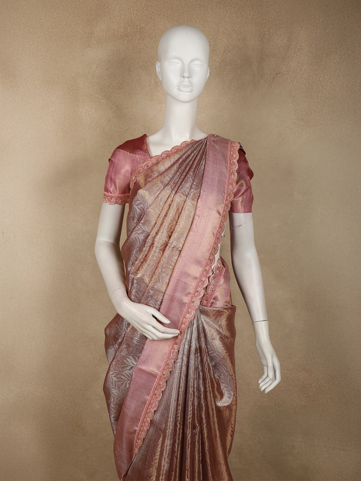 The dusty rose–copper hue lends a sophisticated warmth, enhanced by the airy sheen of tissue fabric that falls gracefully with every pleat. Adding a touch of elegance, the saree is finished with a neatly detailed sequins border, lending just the right amount of sparkle for festive and special occasions.