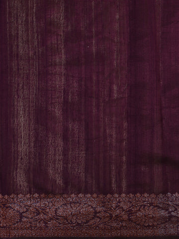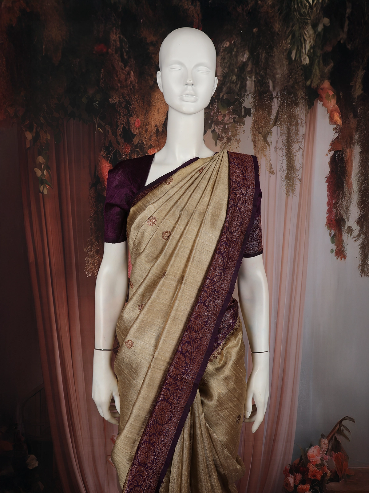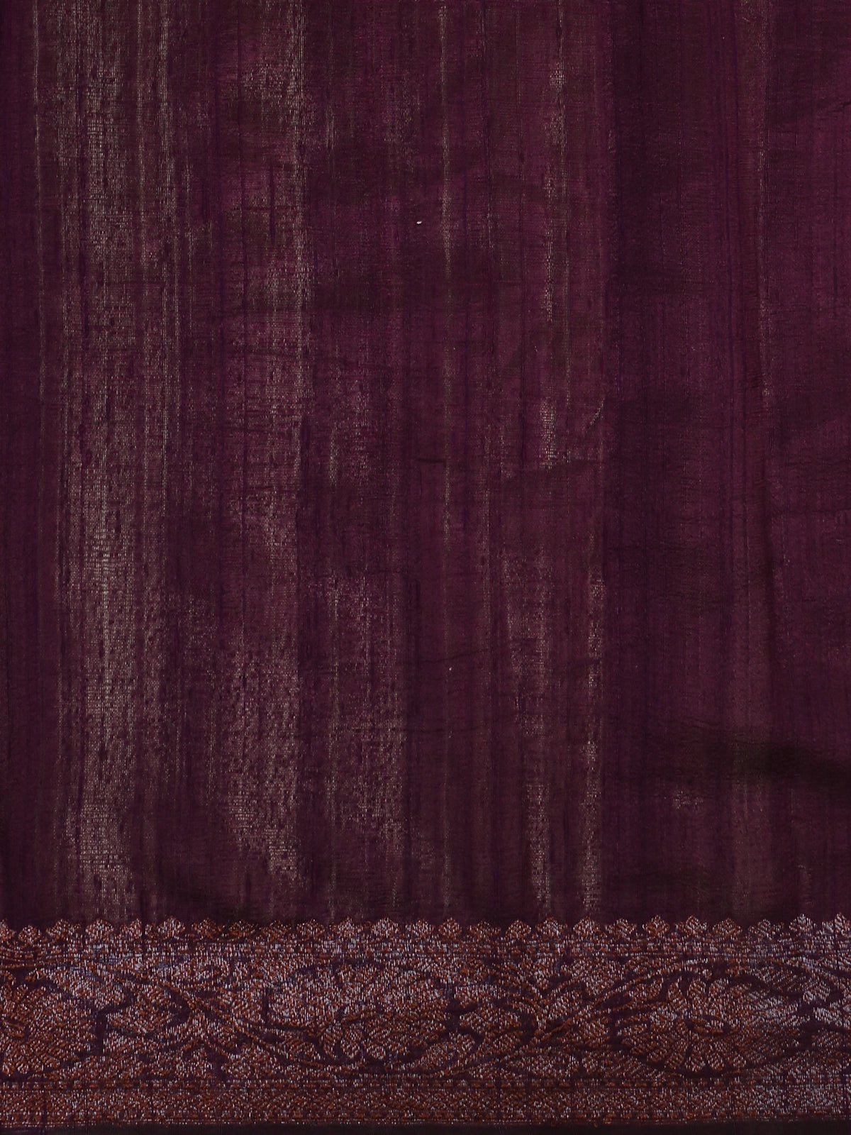 Delicate butta motifs woven in a muted rust-brown hue are evenly scattered across the saree, adding a refined traditional touch without overpowering the base. The highlight of the saree lies in its contrast woven border, rendered in a deep wine–plum shade with intricate antique copper zari floral patterns, creating a striking yet harmonious contrast against the soft beige body.