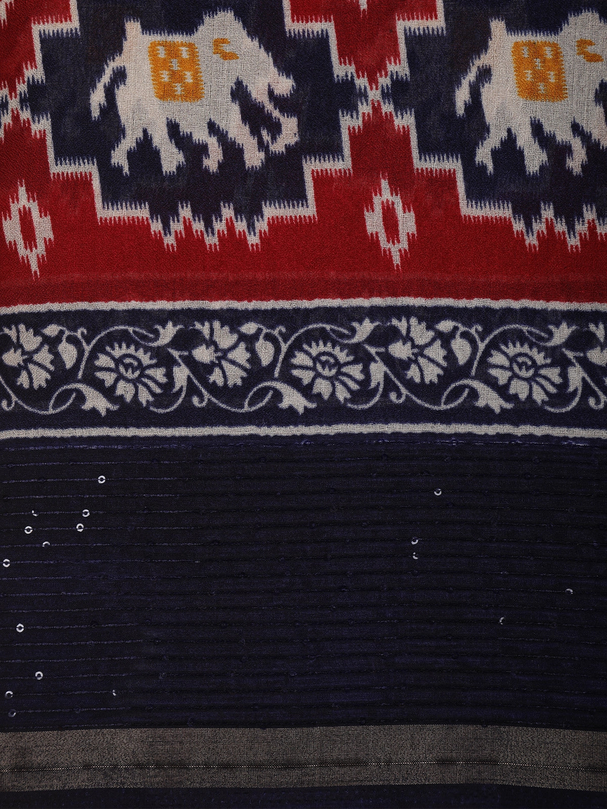 The highlight of this saree lies in its beautifully designed pallu panel, adorned with striking geometric patterns in rich crimson red and deep navy blue tones, complemented by elegant animal-inspired motifs that lend a touch of ethnic charm. The intricate printed detailing enhances the visual appeal, making the saree stand out with its bold yet balanced design.